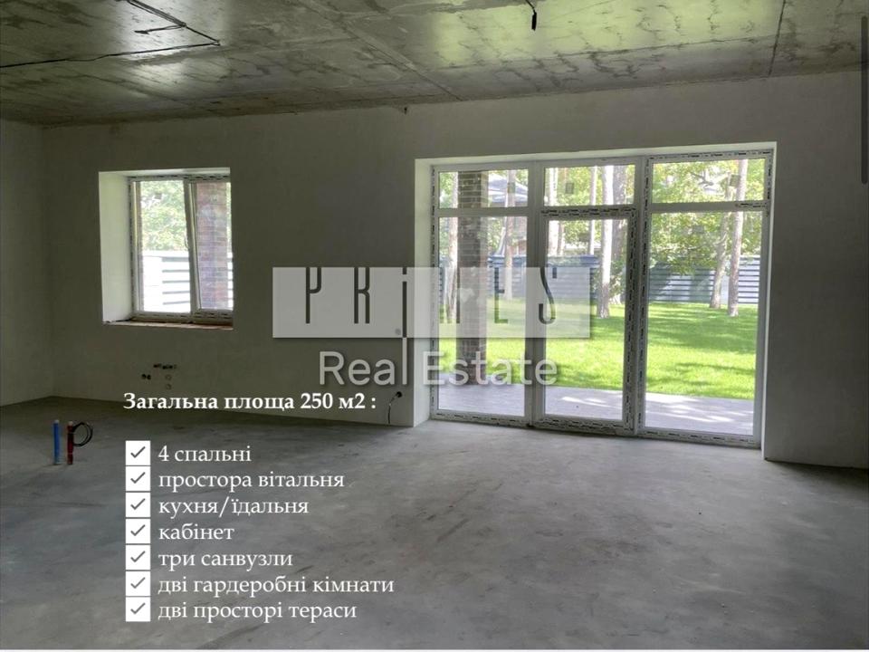 Будинок площею 250 м2 включає: 4 спальні, велика вітальня з каміном, кухня / їдальня зі своїм виходом на літню криту терасу першого поверху, кабінет, три санвузли, 2 гардеробні кімнати, а також велика тераса з виходом з господарської майстер спальні.