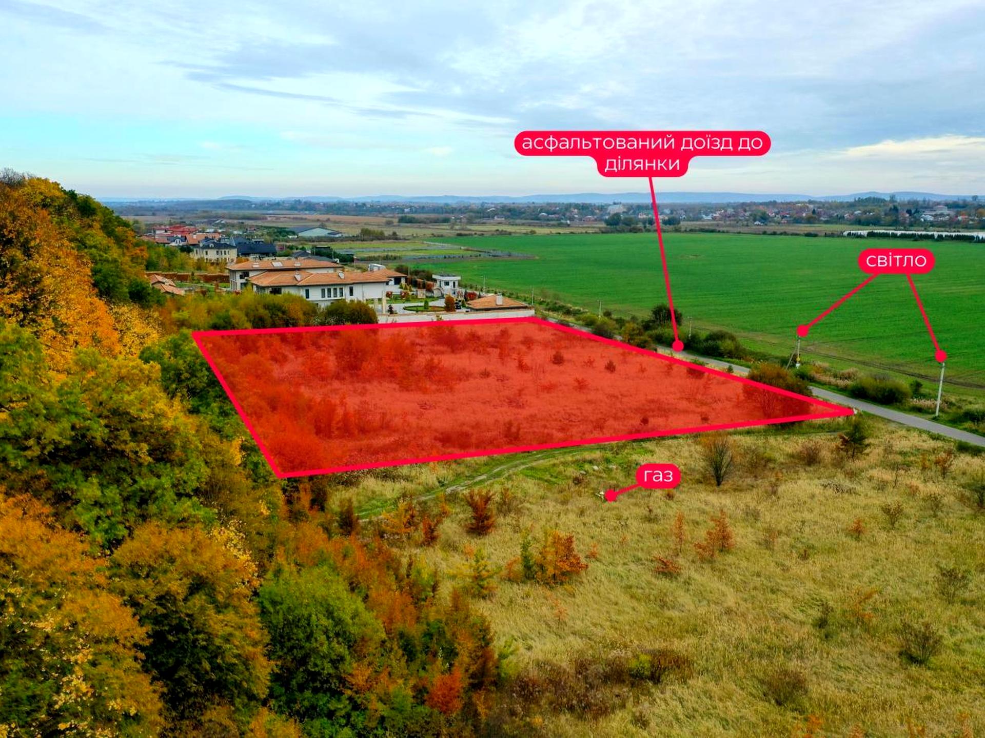 Особливості даної ділянки — простора, кутова, велика, рівна, ділянка квадратної форми, що ідеально підходить для будівництва котеджного містечка, або містечка з окремостоячими особняками. Пряма межа з лісом , одна сторона межує по всій довжині , навпроти не буде будинків . Гарний краєвид і близькість до міста Львів і Винники.