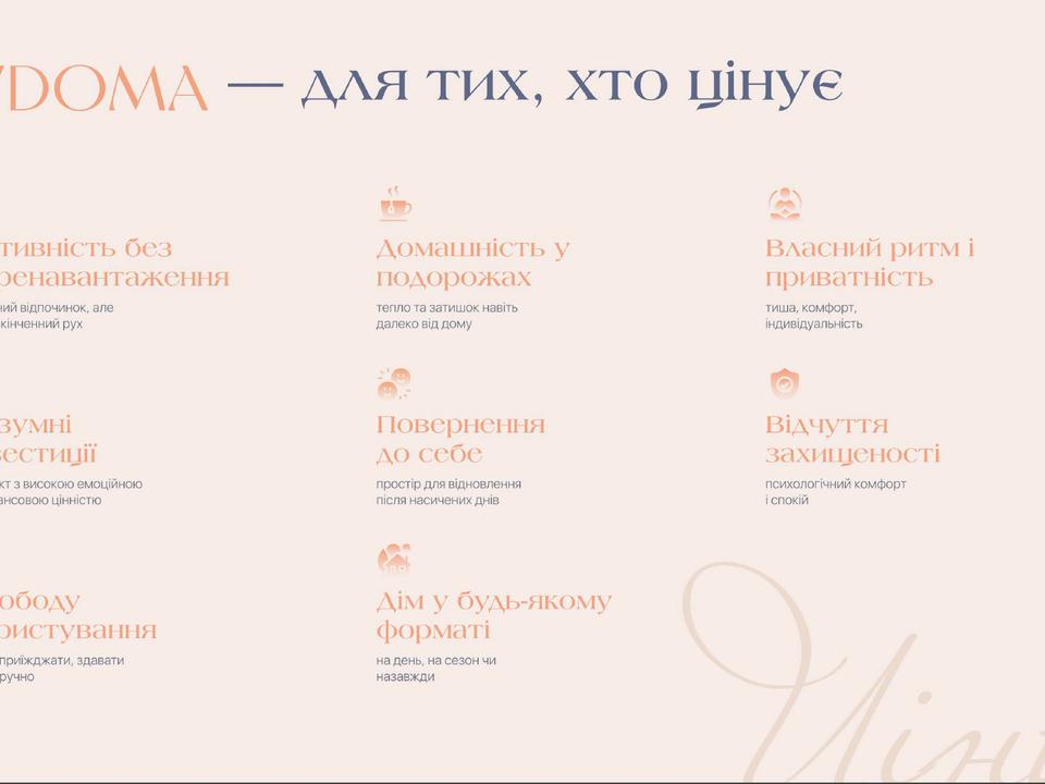 Це сучасна архітектурна концепція для тих, хто прагне мати поруч усю інфраструктуру курорту, не відмовляючись від тиші, комфорту та відчуття особистого простору. У VDOMA ви отримуєте баланс активного курортного життя та спокою власного дому.