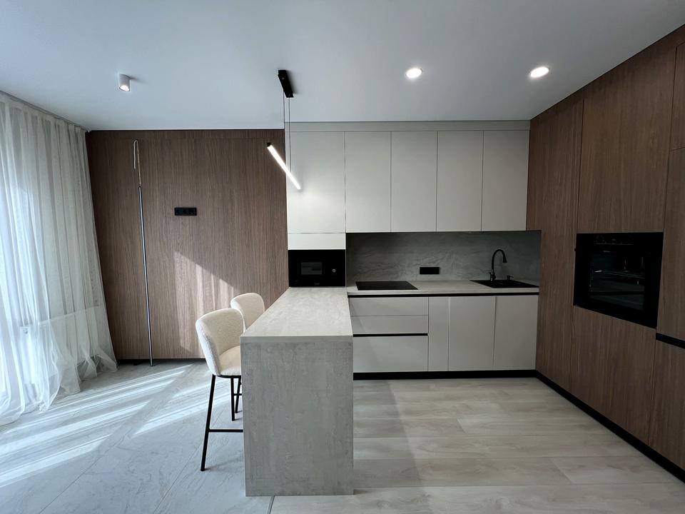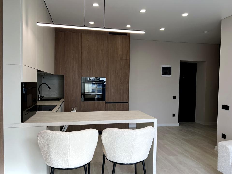 Кухня-вітальня, обладнана вбудованими меблями, та сучасною якісною технікою: посудомийна машина, холодильник, індукційна плита, мікрохвильова піч,духовий шкаф, витяжка та установлений кондиціонер.