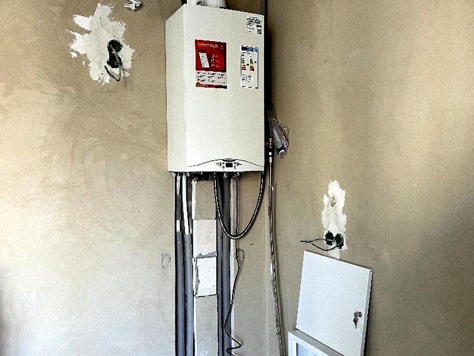 У квартирі вже виконані базові роботи: розведена електропроводка, оштукатурені стіни, встановлені радіатори та двоконтурний газовий котел.