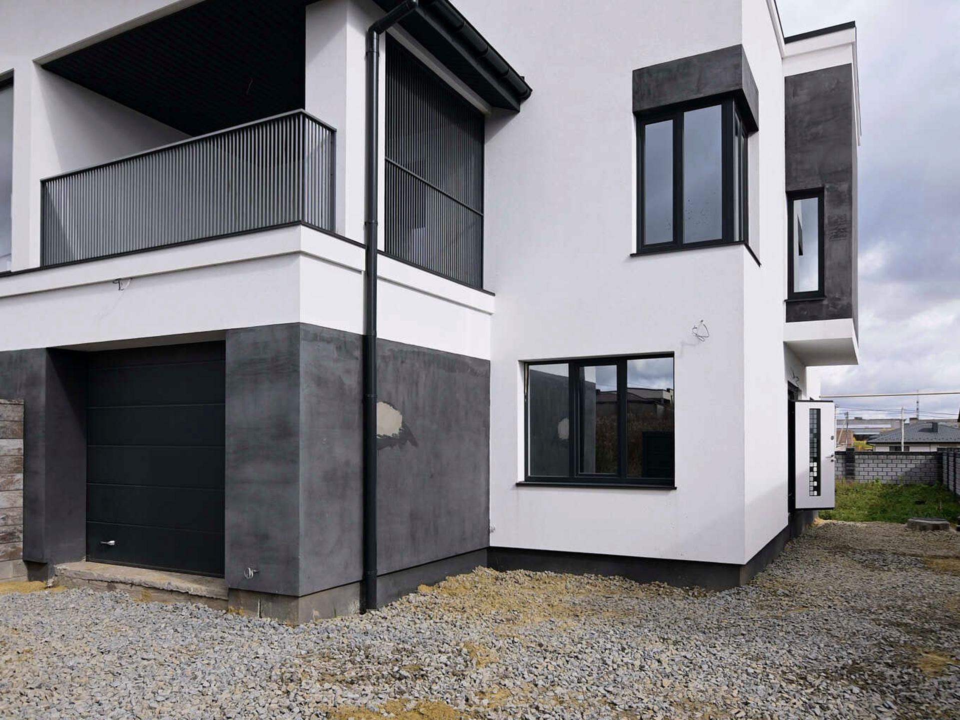 - 1-й поверх: кухня, вітальня, гостьова кімната, санвузол, кладова, вихід в гараж.