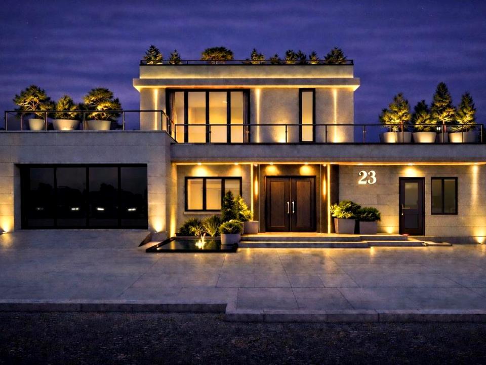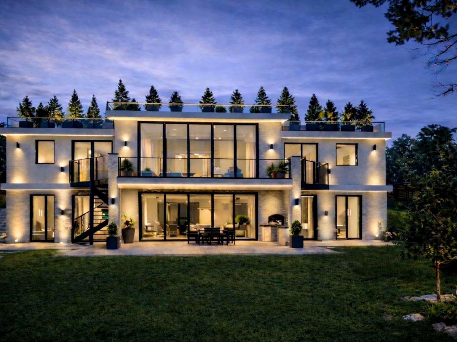 Особливості даного будинку — перша лінія лісу, вітальня з 5 - метровою стелею та панорамним склінням, власна SPA- зона (сауна, джакузі) та басейн з підігрівом, пʼять рівнів терас 240 м2 включаючи зону барбекю та панорамний дах. Автономна квартира - студія для гостей. Тепла підлога по всьому будинку та дві майстер - спальні.
