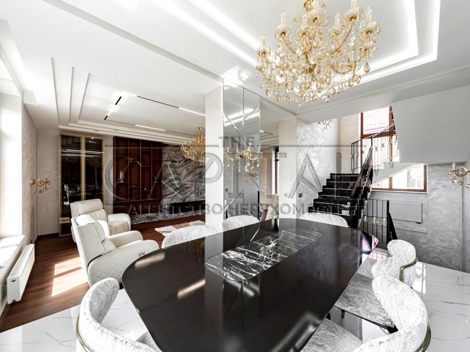 Перший поверх - хол, кухня AYAX (кварц натуральний),техніка Miele, їдальня (меблі NE STANDART та GABBA), камінна зала (електричний камін) з меблями BLANCHE, санвузол, тераса.