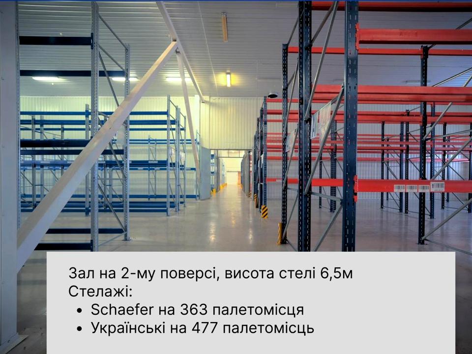 Оренда складського приміщення — 2-й поверх, 993,4 м² склад + 340 м² офісні + підсобні приміщення. Пропонується в оренду просторий складський зал на 2-му поверсі площею 993,4 м² + 340 м² офісні та підсобні приміщення. Приміщення підходить для палетного зберігання, комплектації, внутрішньої логістики та розміщення стелажних систем. Висота стелі — 6,5 м, що забезпечує ефективне використання об’єму та зручну роботу складської техніки. Для товарів, що потребують температурного режиму, передбачені холодильні потужності: вбудована холодильні камера площею 22,3 м². Доступ і вантажопідіймальні можливості: Для переміщення вантажів на другий поверх передбачено два вантажні підйомники вантажопідйомністю 1500 кг, що дозволяє організувати безпечну та стабільну подачу товару в зал і вивезення готових відвантажень. Рампи підготовлені для інтенсивної роботи транспорту: - оснащені доклевелерами та докшелтерами (гумовий бампер) - встановлені захисні ролети - передбачені сигналізація (кожна рампа окремо) та відеоспостереження для контролю вантажних операцій Стелажі та місткість зберігання: - Schaefer — 363 палетомісця - стелажі українського виробництва — 477 палетомісць Інженерні умови та комфорт: У приміщенні передбачені інженерні системи для стабільної експлуатації, зокрема вентиляція/кондиціювання та контроль температури, а також водяне опалення від власної котельні, генератор. Підлога — полірований залізобетон із полімерним покриттям, що підходить для інтенсивних навантажень. Також є природне освітлення завдяки вікнам. Безпека: На об’єкті реалізовані базові системи безпеки: пожежна та охоронна сигналізація, відеоспостереження. Локація та логістика: Складський комплекс розташований поблизу кільцевої дороги та має зручні під’їзні шляхи, що спрощує логістичні операції. Вартість: 250 грн/м2 + комунальні платежі.