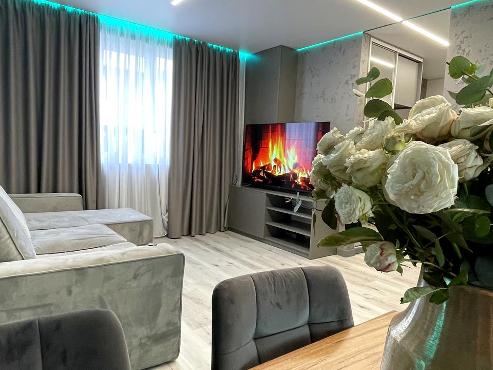 Дерев’яне ліжко 1,8х2м, TV Samsung QLED 65" 4K, приліжкові тумбочки, тумба під телевізор з підсвіткою, вбудована шафа , світлові лінії та регульована контурна підсвітка по периметру кімнати.