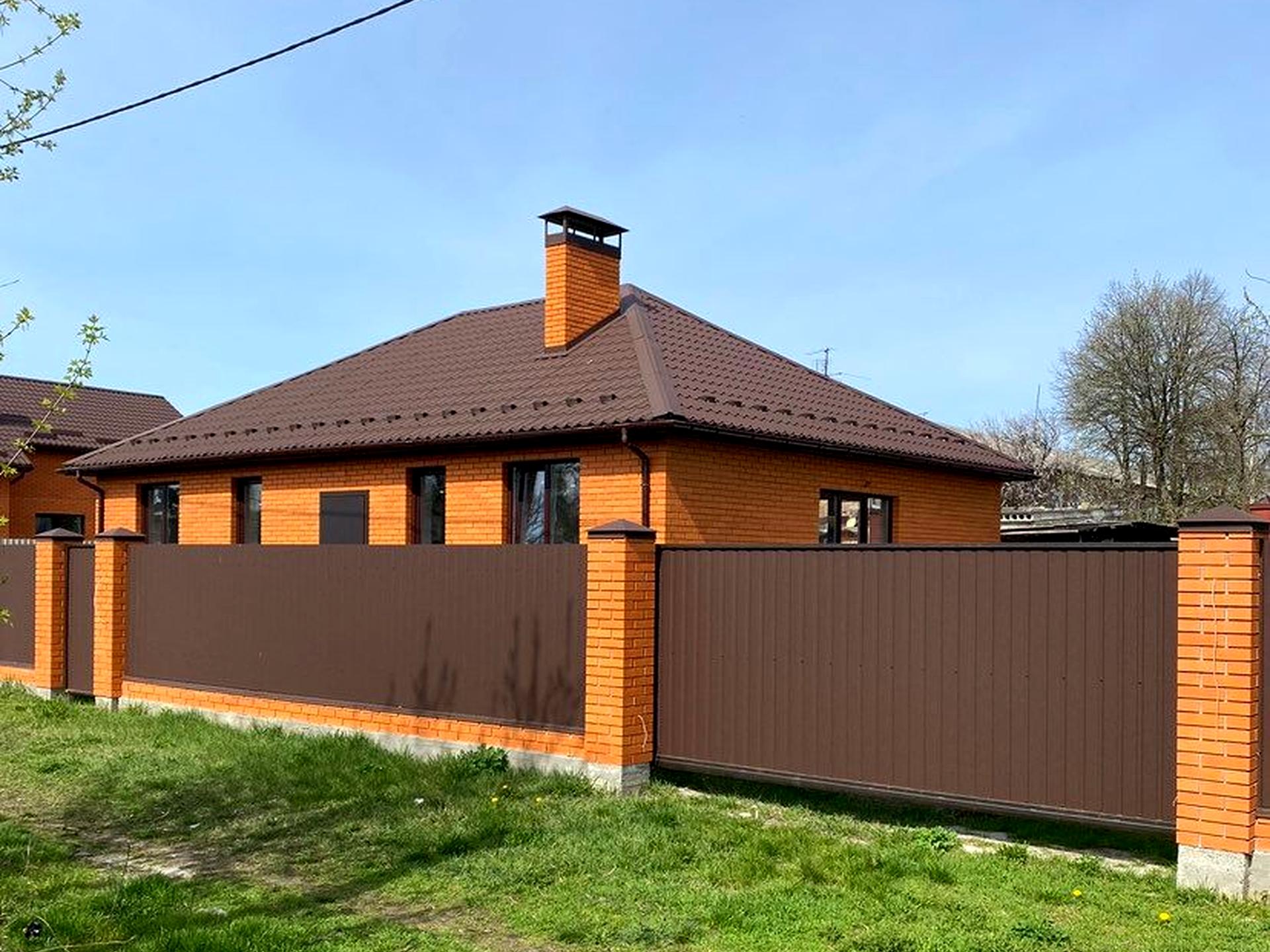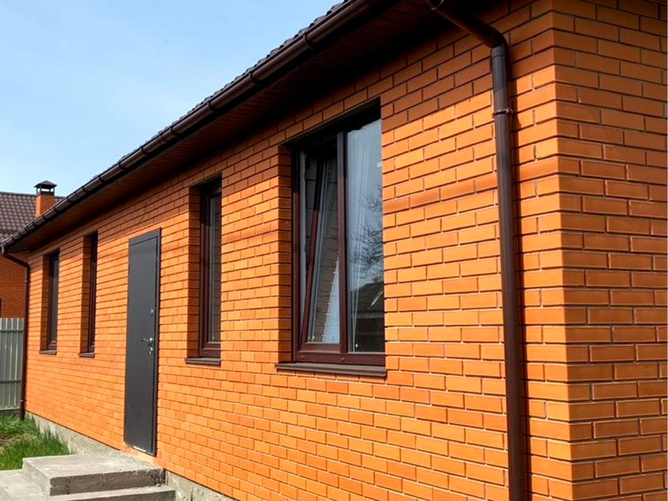 Фасад з червоної цегли, утеплювач мінеральна вата та газоблок, загальна товщина стіни 50 см.