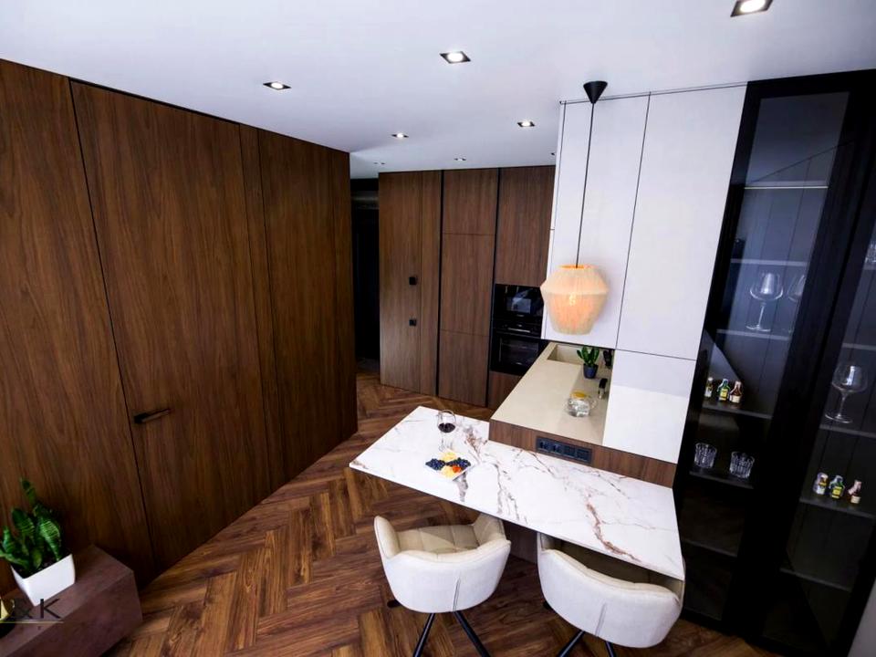 Корпусні та м’які меблі - індивідуального виготовлення від M&Kmebel з фурнітурою Blum та фасадами Saviola і Cleaf. Стільниці, умивальник і мийка - з керамограніту Laminam. Сантехніка - [ссылка скрыта] Black.