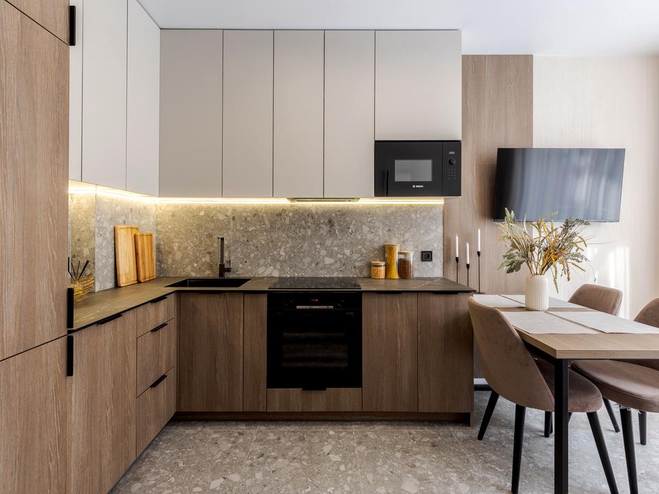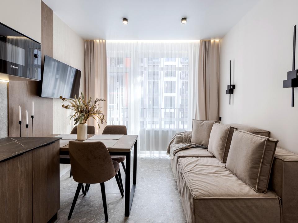 В квартире 1 комната, Технологія будівництва - Монолітно-каркасна, Тип будинку - Спец. проект. Планировка комнат Раздельная. В квартире есть Телевизор, Подогрев полов, Кондиционер, Стиральная машина, Ванна, Холодильник, Микроволновка, Посудомойная машина. Дом построен в 2025 году. Общее состояние квартиры - С ремонтом. Безбарьерность: вход в дом на уровне земли, парковочные места для людей з инвалидностью. Работает без света - вода. Комиссия за услуги 4 %