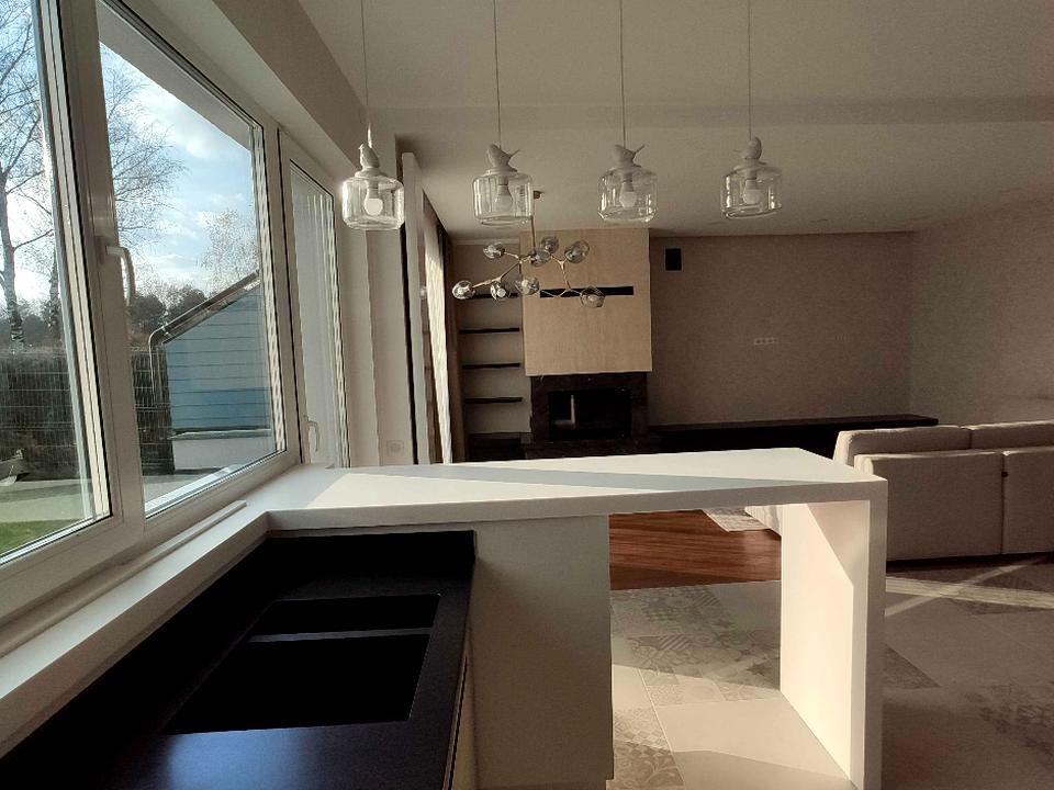 Весь будинок подбудовано та виконано з наголосом на екологічність матеріалів: підлога покрита олією ,замість лаку, усі підвіконня зі сторони вулиці- гранітні, зі сторони дому- з кам’яної крихти. Опалення можливе у трьох варіантах : електричне(за допомогою кондиціонерів до температури мінус 15 град., є 4 кондиціонери), газове(теплі підлоги та дизайнерські радіатори), за допомогою каміна(оснащений турбіною та тепловими рукавами з виводами у кожну кімнату)