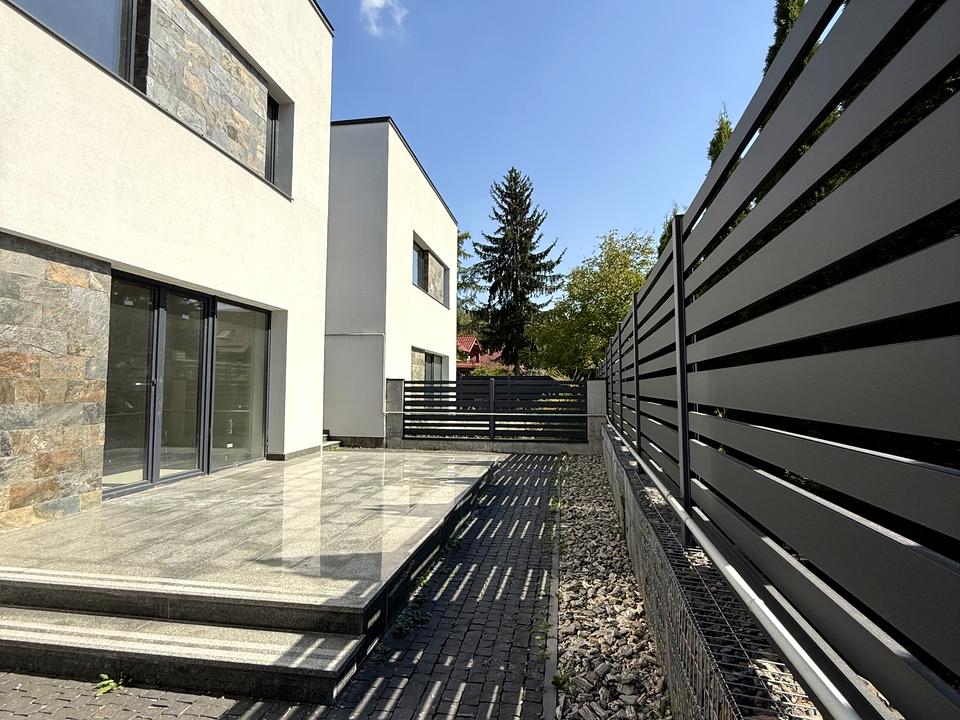 Велика ділянка перед будинком, а також задній дворик вимощені бруківкою, територія обгороджена парканом. В будинку багато денного світла. Збудований з якісних матеріалів.