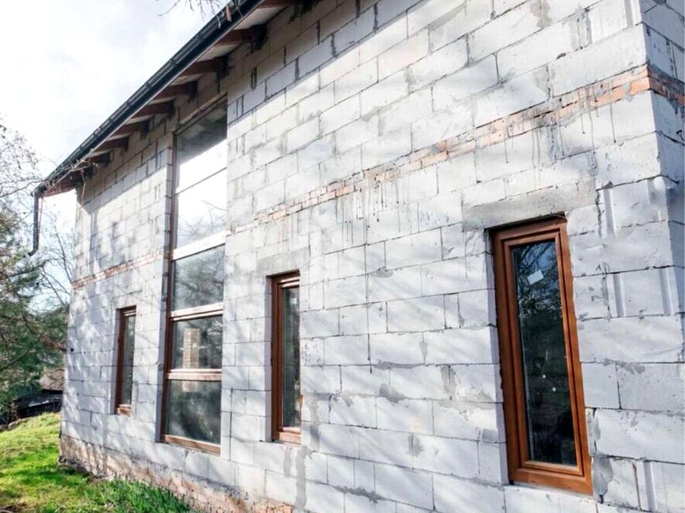 Матеріали: Основна конструкція виконана з газоблоку, що забезпечує відмінну теплоізоляцію. Фундамент та перший поверх оздоблені цеглою, а внутрішні перегородки зведені з того ж газоблоку. Усі стелі підшиті плитами OSB, що створює готову основу для фінішної обробки.