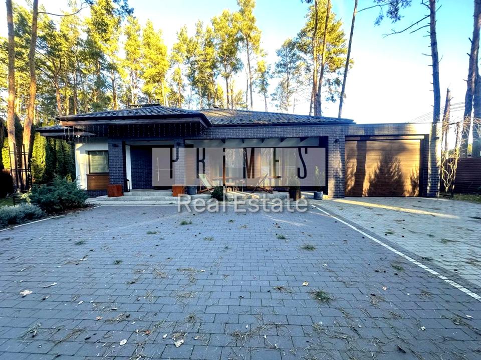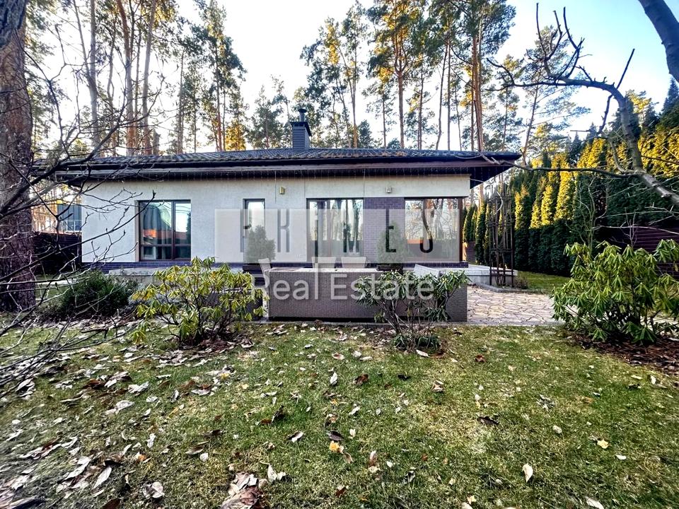 Цей одноповерховий будинок (135 м² + гараж) розташований на великій ділянці в 8,5 соток серед хвойних дерев, з якісним ландшафтним дизайном, автоматичним поливом, панорамними вікнами, терасою та зоною барбекю.