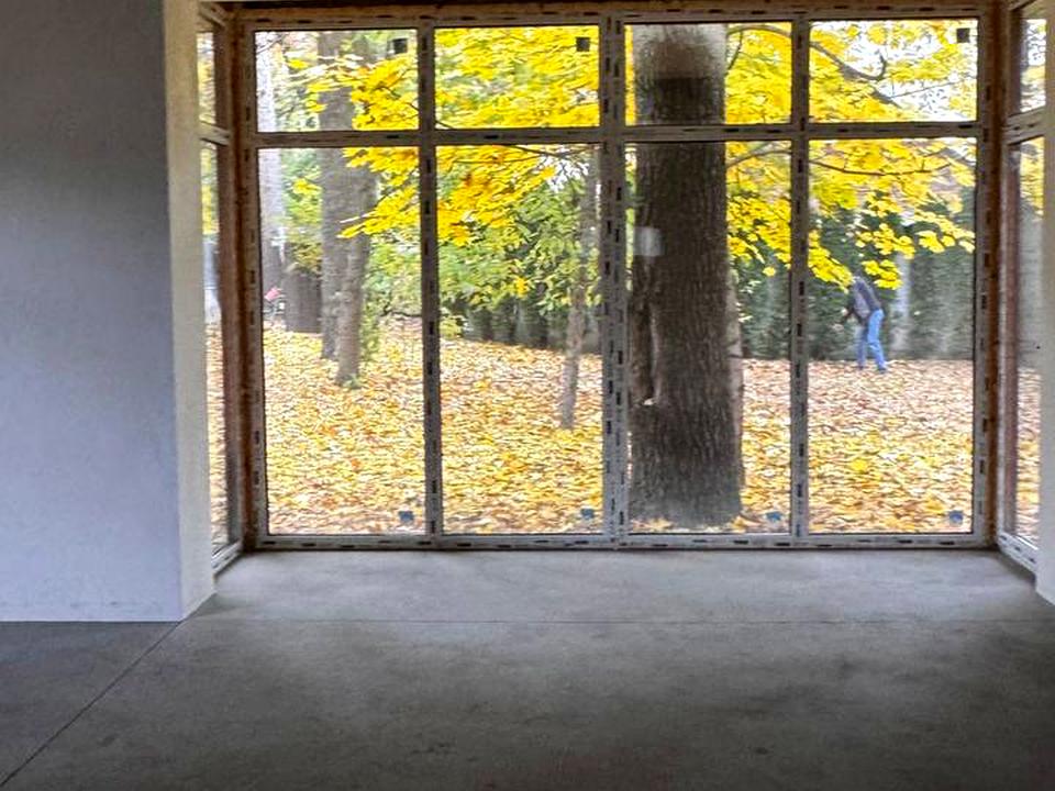 Кухня-вітальня з двома великими панорамними вікнами, де відкривається вигляд на дерева.