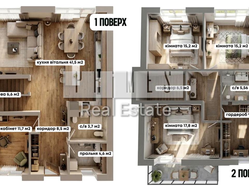 3 спальні (2 дитячі + master з гардеробною та санвузлом) Простора вітальня з каміном і подвійним світлом
