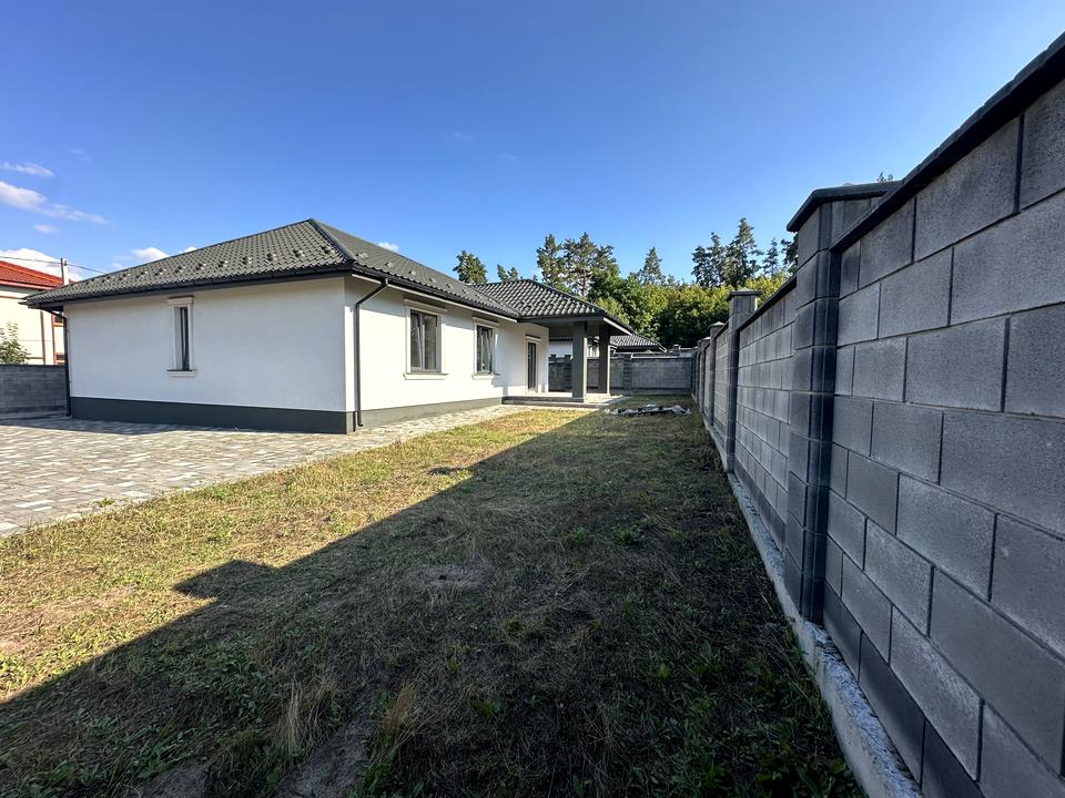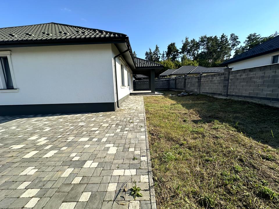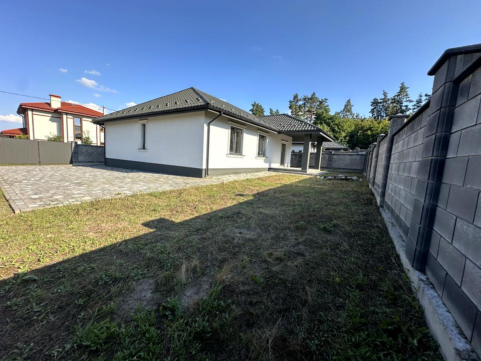 Дом, 1 этаж, 3 комнаты. Материал стен – газоблок. Подъезд к дому – асфальт. Площадь участка 5 соток. Высота потолков 2.7 метра. Вид из окон во двор. Планировка комнат Раздельная. Газ на улице. Отопление котел электрический. В доме 2 совместных санузла. Входная дверь бронированная. Нет покрытия полов. Тип кухни - кухня-студия. Окна металлопластиковые, новые. Покрытие крыши - металлочерепица. Есть ограждение. Дом построен в 2024 году. Своя канализация. Общее состояние дома - От строителей (с отделкой). Рядом есть лес, супермаркет. Наружное утепление стен. Владелец соглашается продать по программе єОселя. Без комиссии
