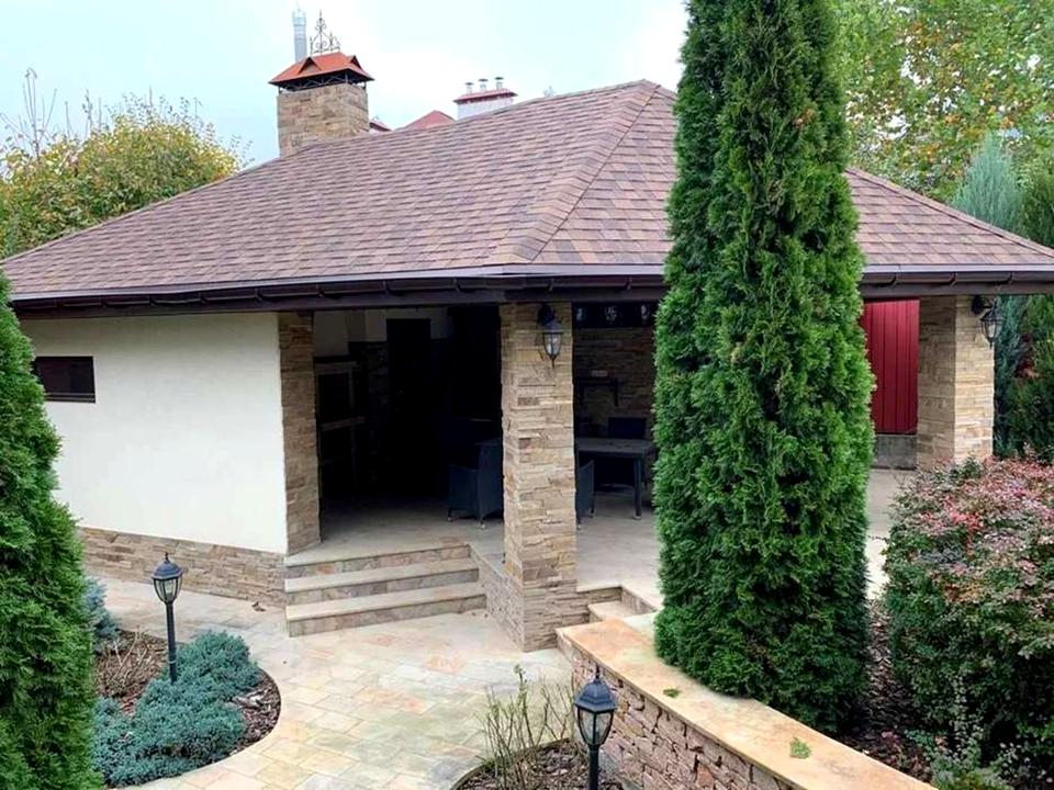 Продам 2-х поверховий будинок в селі Чайки Котеджне містечко закритого типу, в 5 км від Київського метро Житомирська. У будинку 2 поверхи + цокольний поверх - 413м2. У вартість входить ділянка площею 8 соток. Будинок побудований з якісних будівельних та оздоблювальних матеріалів. Міжкімнатні двері і частина меблів виготовляються на замовлення з натурального дерева, а також антикварні меблі. Сходова клітка виконана з мармуру і кованих елементів. Ландшафтний дизайн, клумби, доріжки, генератор світла, кімната садового інвентарю, відкрита альтанка з зоною барбекю, зберігання дров. Встановлено охоронну сигналізацію та відеоспостереження. Будинок розташований в закритому котеджному містечку Сонячний. Автополив, висаджені магнолії та інші квітучі рослини. Басейн критий, розсувний. Ділянка огороджена. Автоматичні ворота. До будинку прибудований гараж на дві машини, додатково є навіс для однієї машини. 1 поверх: камінний зал, кухня-студія, підігрів підлоги, санвузол, кабінет зі збройовою палатою, вихід в гараж. 2-й поверх: 3 спальні, кожна зі своєю гардеробною з ванною, душовою кабіною, ванною кімнатою та біде, підігрівом підлоги у ванній кімнаті та гардеробними. Підлога другого поверху – паркет. Більярдна на першому поверсі з баром і зоною для куріння сигар, пральня, котельня і ванна кімната. Будинок підключений до централізованого водопостачання та міської каналізації.
