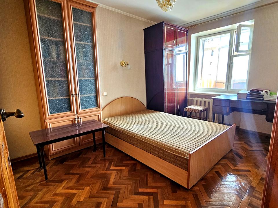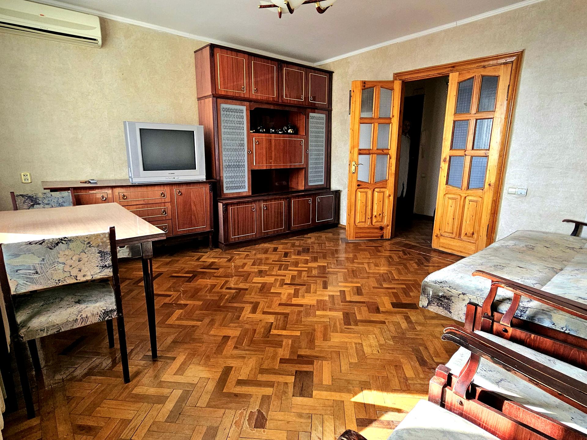 Квартира у житловому стані: збережений паркет, пофарбовані стелі, шпалери та кахель.