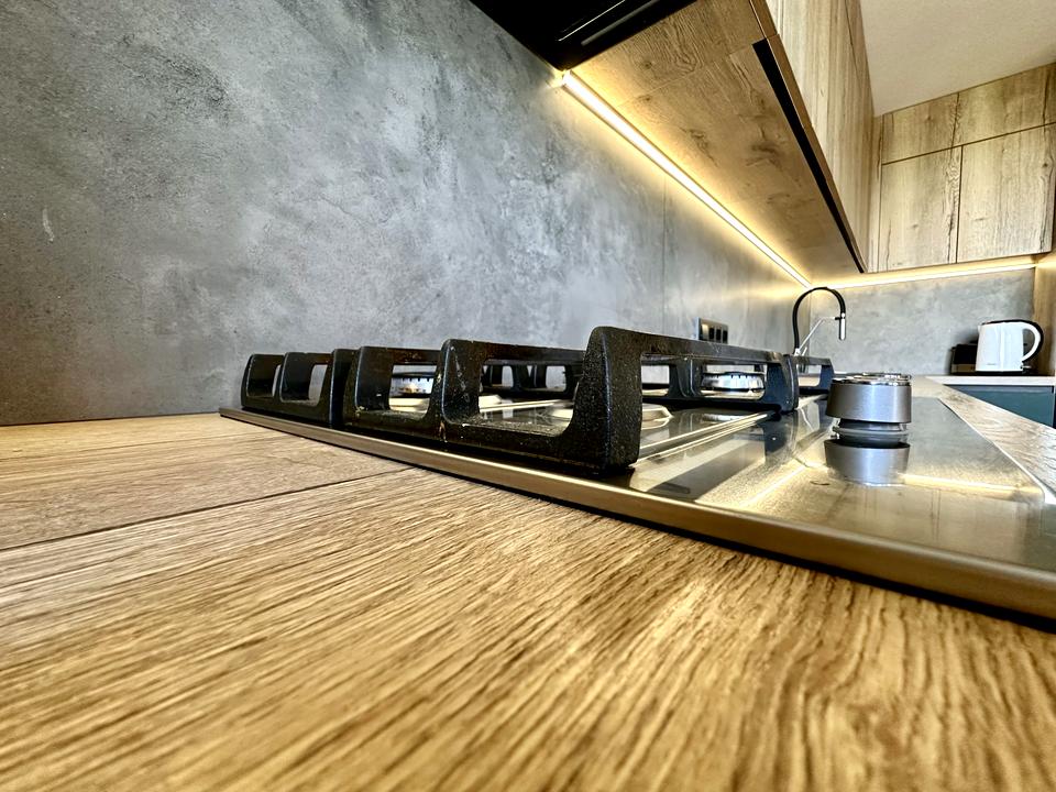 🔹 Кухня-вітальня — open space. Просторо. Світло. В центрі — острів. Можна снідати, працювати, дивитись, як дитина будує місто з кубиків просто на підлозі.