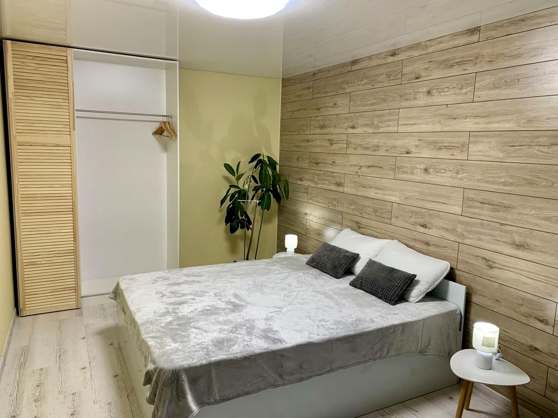 Меблі: двоспальне ліжко, шафа, обідня зона