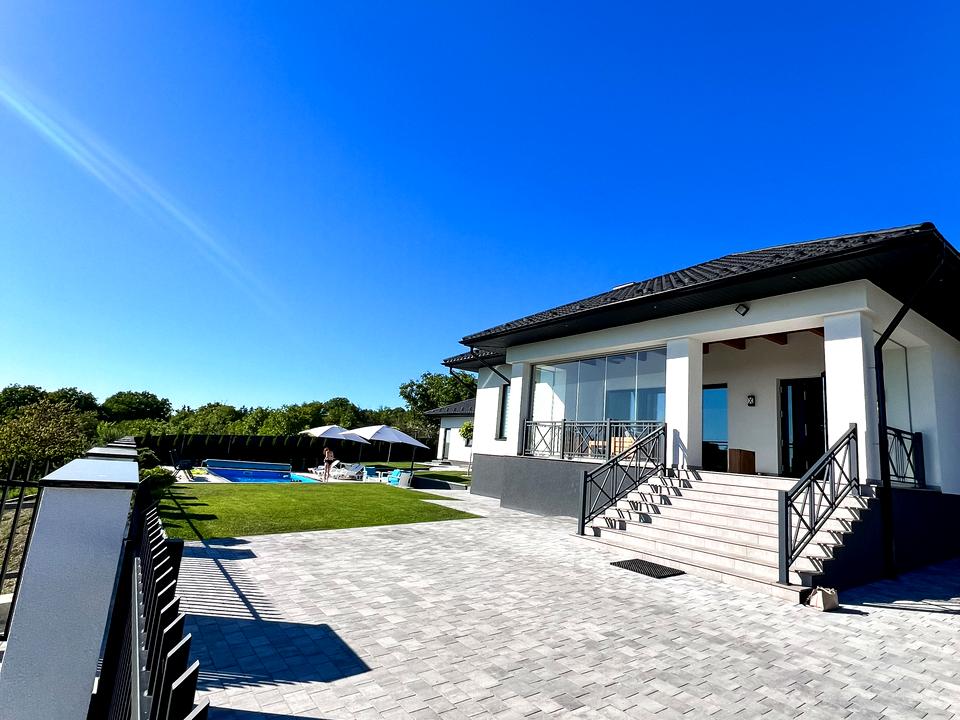 Територія огороджена парканом, має ландшафтний дизайн, автоматичний полив, навіс на автомобіль, басейн, сауну, підвал.