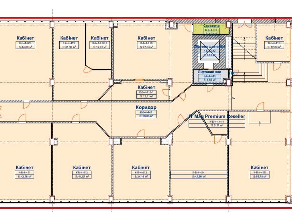 Планування - кабінетне, серверна. Корисна площа - 489 м.кв., орендована - 588 м.кв.