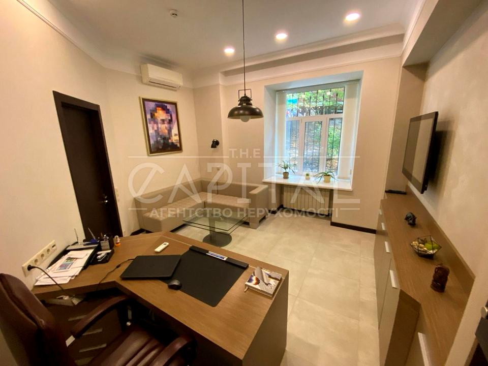 Планування: дві кімнати (кабінет керівника-кімната для перемовин та зал на 4 робочі місця), туалет, кухня, два виходи: окремий на фасад і в підїзд, стаціонарні пожежна і охоронна сигналізації, вхідний тамбур з броньованих дверей та броньованого скла, решітки на вікнах, два кондиціонери, евроремонт, вбудовані та ексклюзивні меблі.