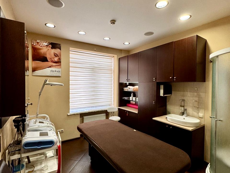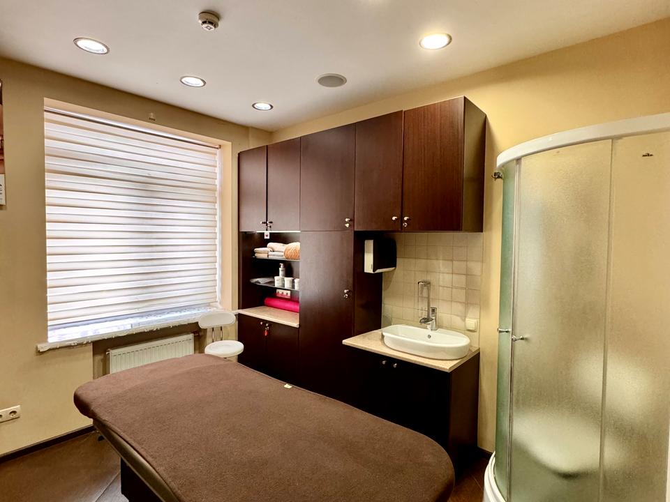 Рецепція, перкукарський зал на 2 крісла, окремий кабінет манікюру-педикюру, окремий кабінет масажу і косметолога з душовою кабіною, солярій, кімната