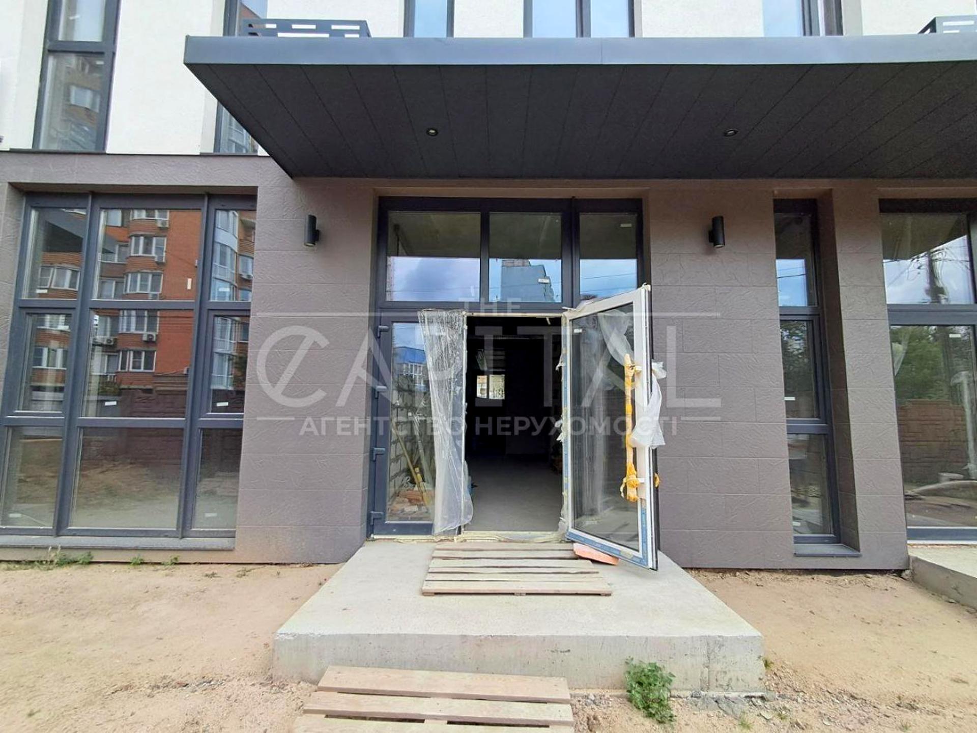Комерційне приміщення на першому поверсі з фасадним розташуванням. Великі вітринні вікна вздовж фасаду роблять об’єкт ідеальним для магазину, шоуруму, кафе або офісу.