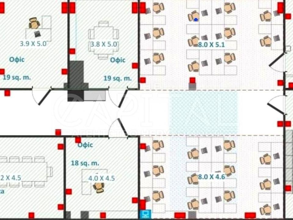 • 7 окремих кімнат, серед яких — кабінет директора, кабінет бухгалтерії, переговорні кімнати;