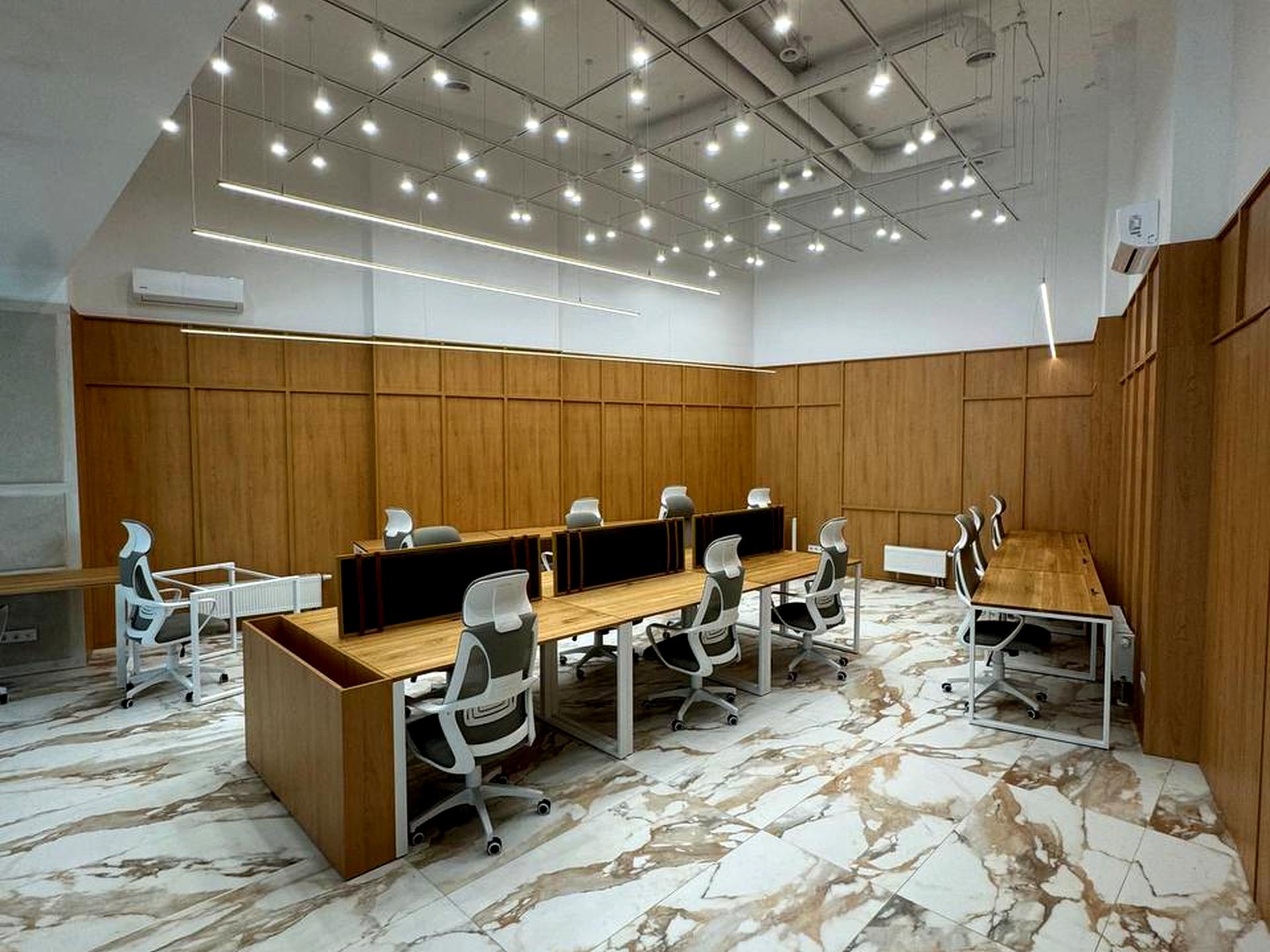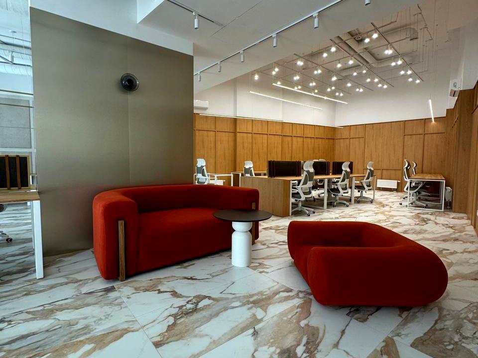 Чітко зонований простір поєднує робочі кабінети, переговорні та комфортні зони відпочинку.