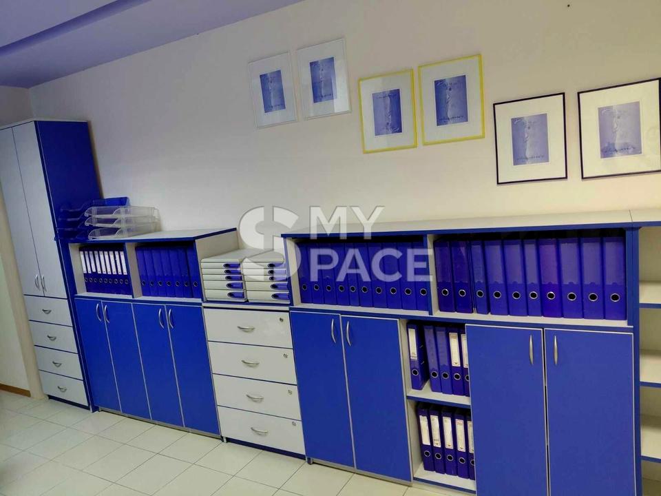 три окремі кабінети (18, 9 і 6 кв. м), простора зала 30 кв. м з обладнаними робочими місцями, комора 4 кв. м зі шафами, кухня з меблями, санвузол. Довгий коридор дозволяє облаштувати додаткові робочі місця.