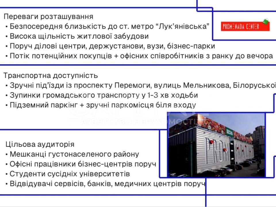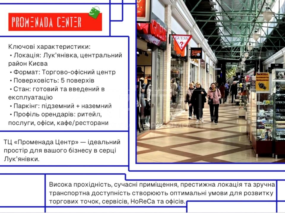 Продається сучасний ТЦ «Променада Центр» у Києві — діючий, з широким асортиментом орендарів і стабільним потоком клієнтів. Загальна площа — 28тис. м², земельна ділянка — 3,5 га. Об’єкт готовий до роботи або ребрендингу: торгові площі, розважальні сервіси, кафе/ресторан, паркінг, власне адміністрування. Ідеально підходить для інвестора або оператора торгової нерухомості, який шукає готовий об’єкт з потенціалом зростання доходу та розвитку
