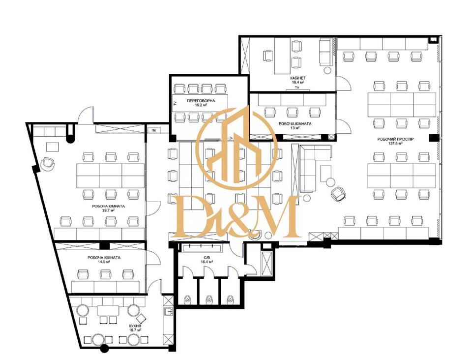 Офіс має сучасний дизайнерський ремонт із використанням якісних матеріалів.