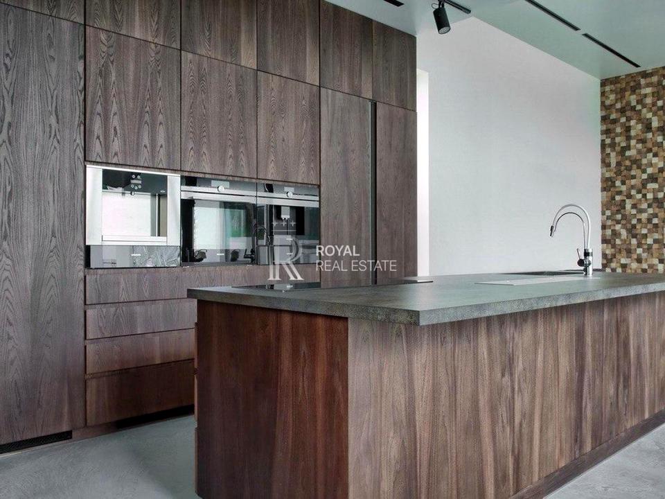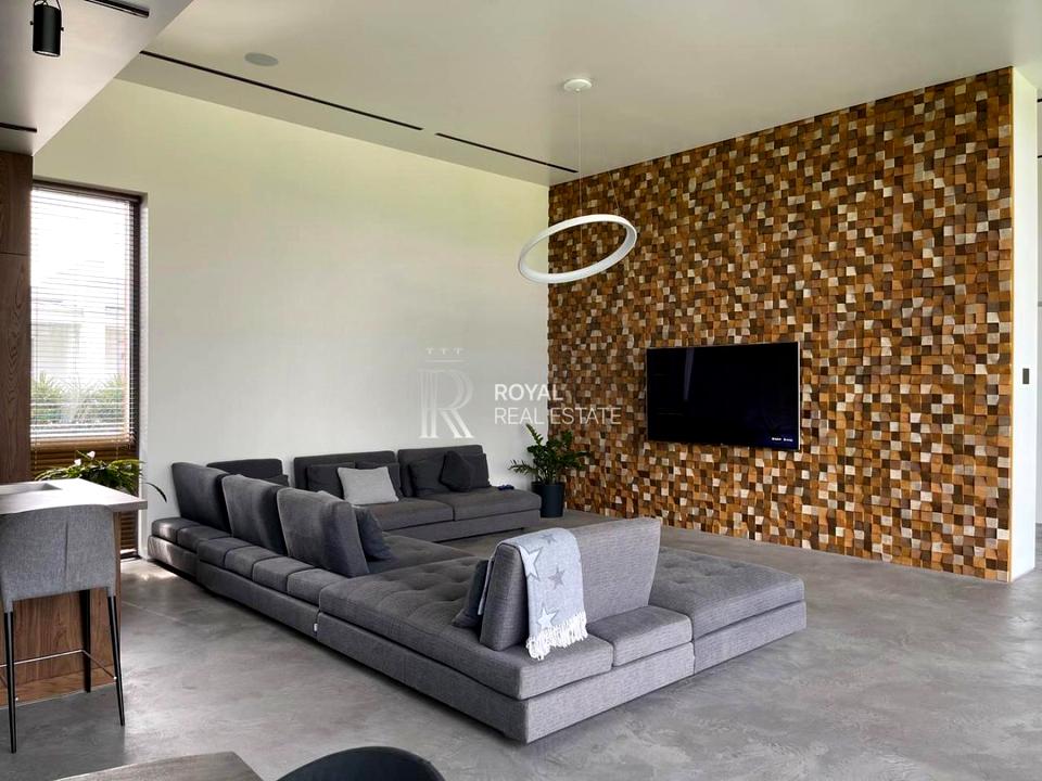 Цей одноповерховий котедж вражає індивідуальним дизайном та чудовою відкритістю приміщень завдяки високим 4-метровим стелям і великим панорамним вікнам. На території є тераса (100 м²), гараж, сауна і відкритий джакузі.