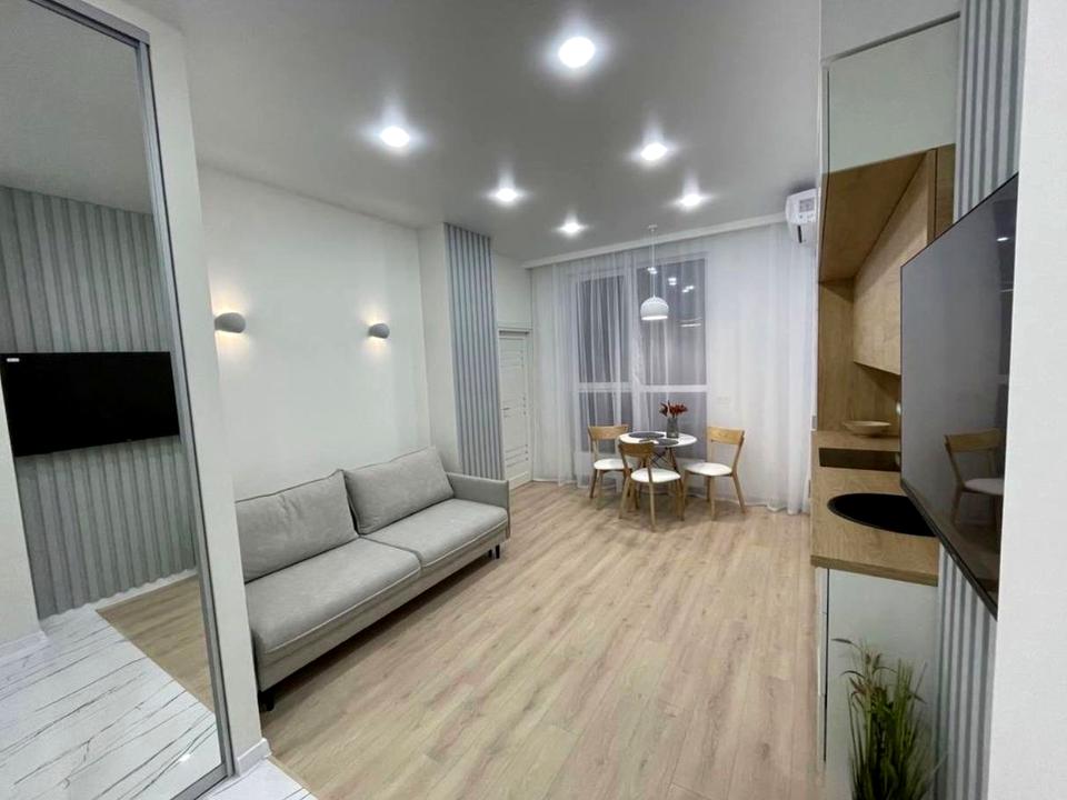 В квартире 1 комната. Планировка комнат Раздельная. Есть горячая вода. Есть отопление. В квартире есть Телевизор, Подогрев полов, Кондиционер, Стиральная машина, Душевая кабина, Холодильник, Микроволновка, Посудомойная машина. Дом построен в 2020 году. Общее состояние квартиры - С ремонтом. Количество санузлов: 1. Интернет оптоволоконный. Работает без света - вода, отопление, интернет. Комиссия за услуги 100 %