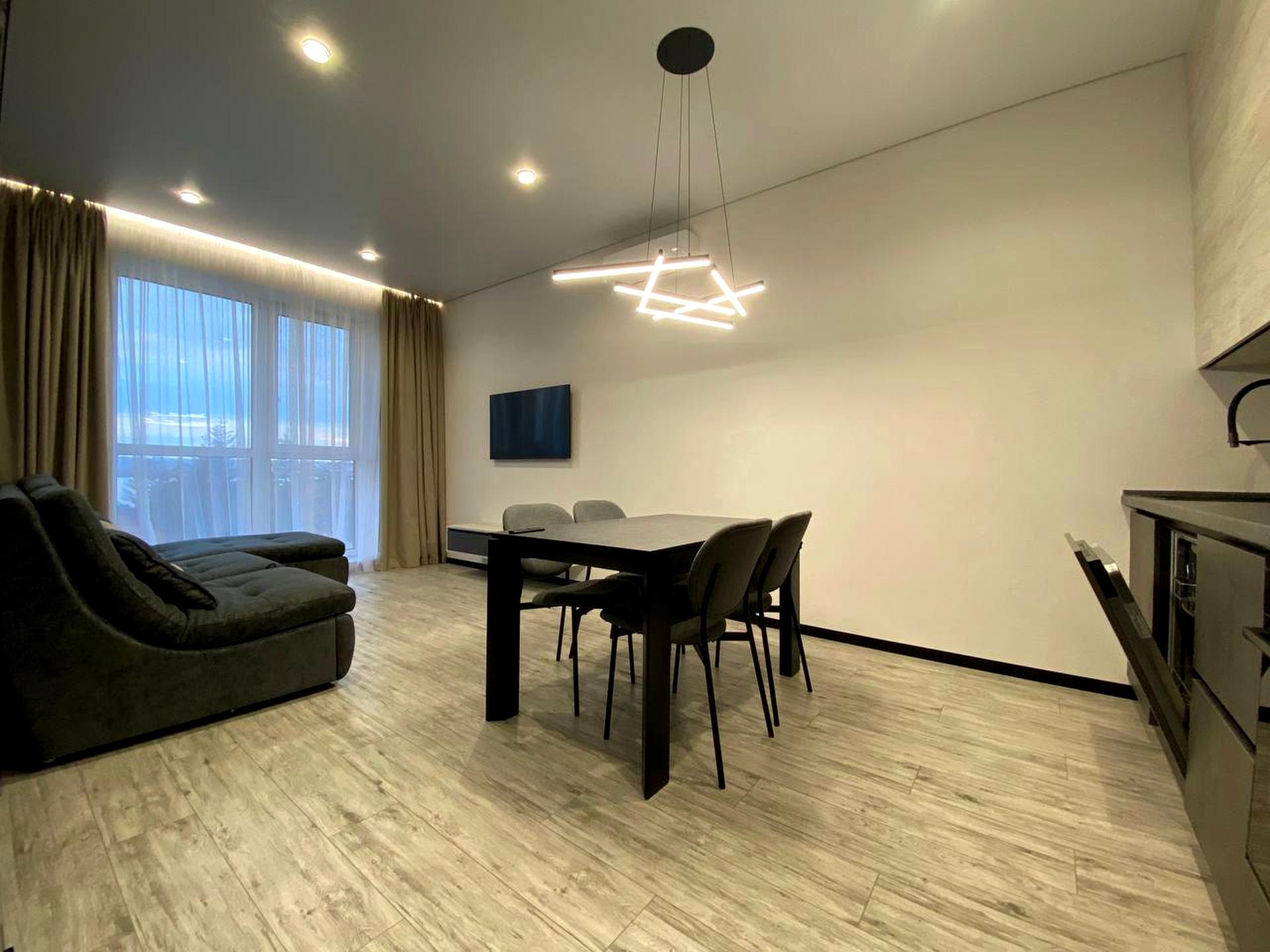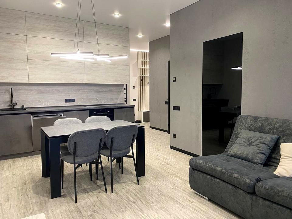 В квартире 2 комнаты, Технологія будівництва - Монолітно-каркасна, Тип будинку - Спец. проект. Кухонная плита электрическая. В квартире есть Телевизор, Подогрев полов, Кондиционер, Стиральная машина, Душевая кабина, Холодильник, Микроволновка, Посудомойная машина. Дом построен в 2021 году. Общее состояние квартиры - С ремонтом. Горячая вода - электрический бойлер. Количество санузлов: 1. Интернет беспроводной. Работает без света - вода, интернет, лифт. Тип кухни - кухня-студия. Количество спален: 1. Есть подземный паркинг, доступный как укрытие. Инфраструктура территории: детская площадка, спортивная площадка, отделенная зона для выгула животных, двор без авто. Комиссия за услуги 75 %