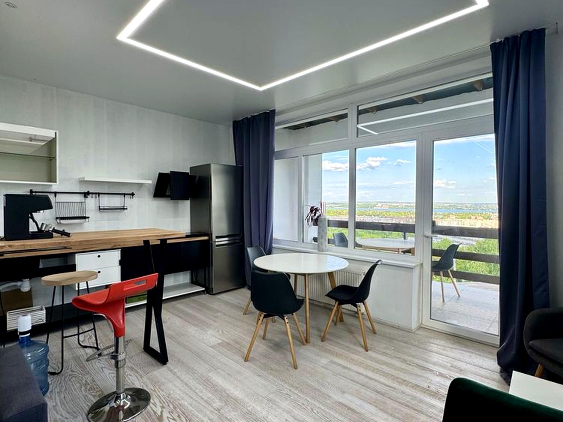 1 этаж 122,6 м2. : кухня студия с террасой с которой открывается отличный вид на Днепр , санузел , спальня со своим санузлом и гардеробной и видовой террасой , спальня