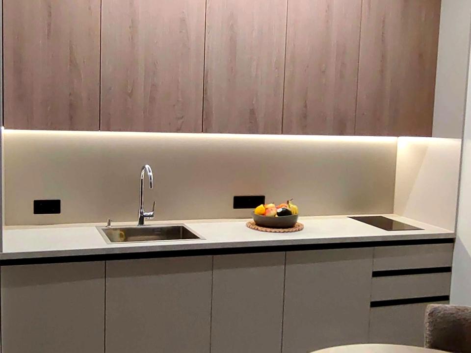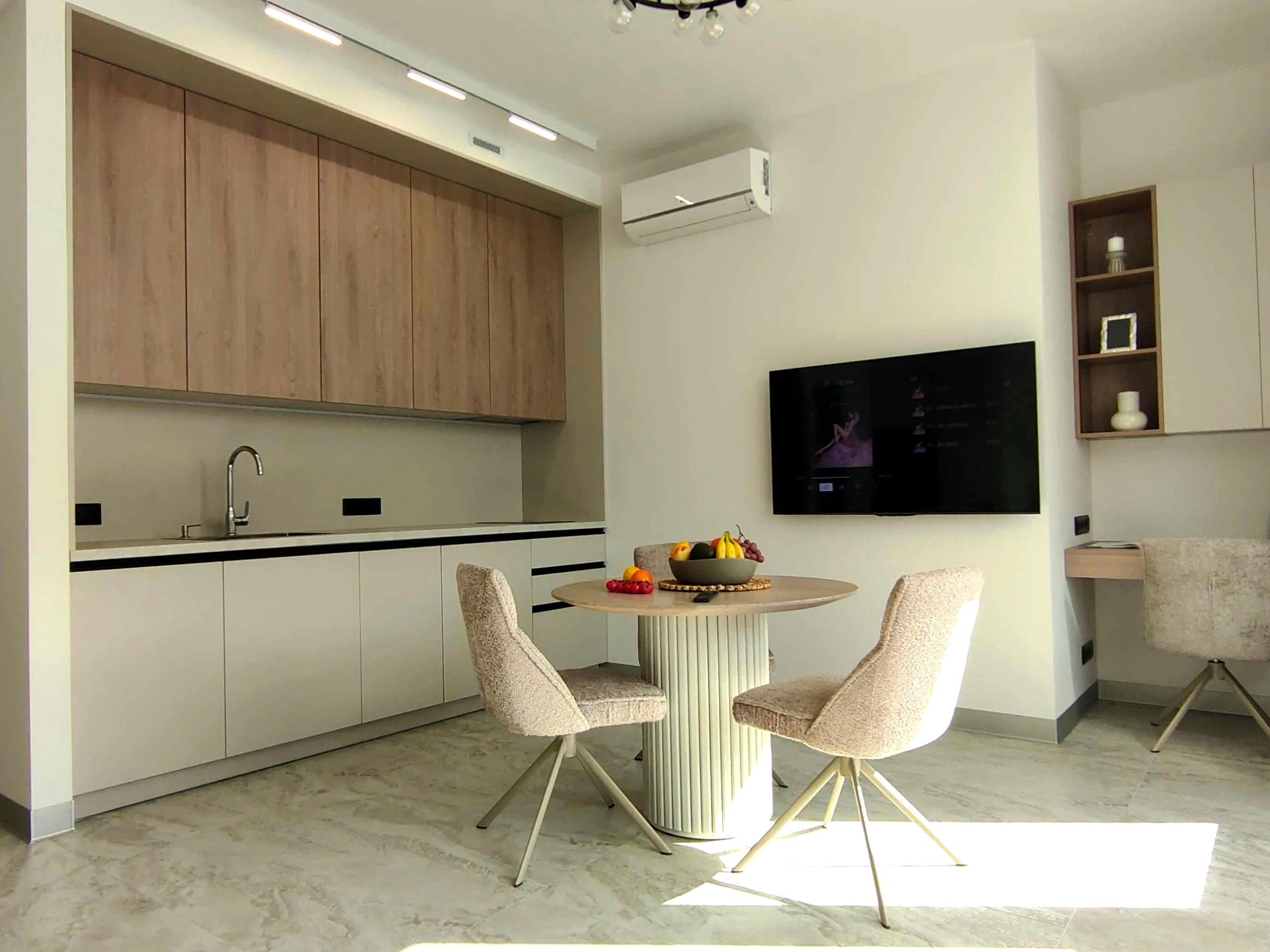 - Кухня обладнана посудомийною машиною, вбудованою духовкою і мікрохвильовою, підсвіткою робочої зони, круглий стіл з 3ма стільцями