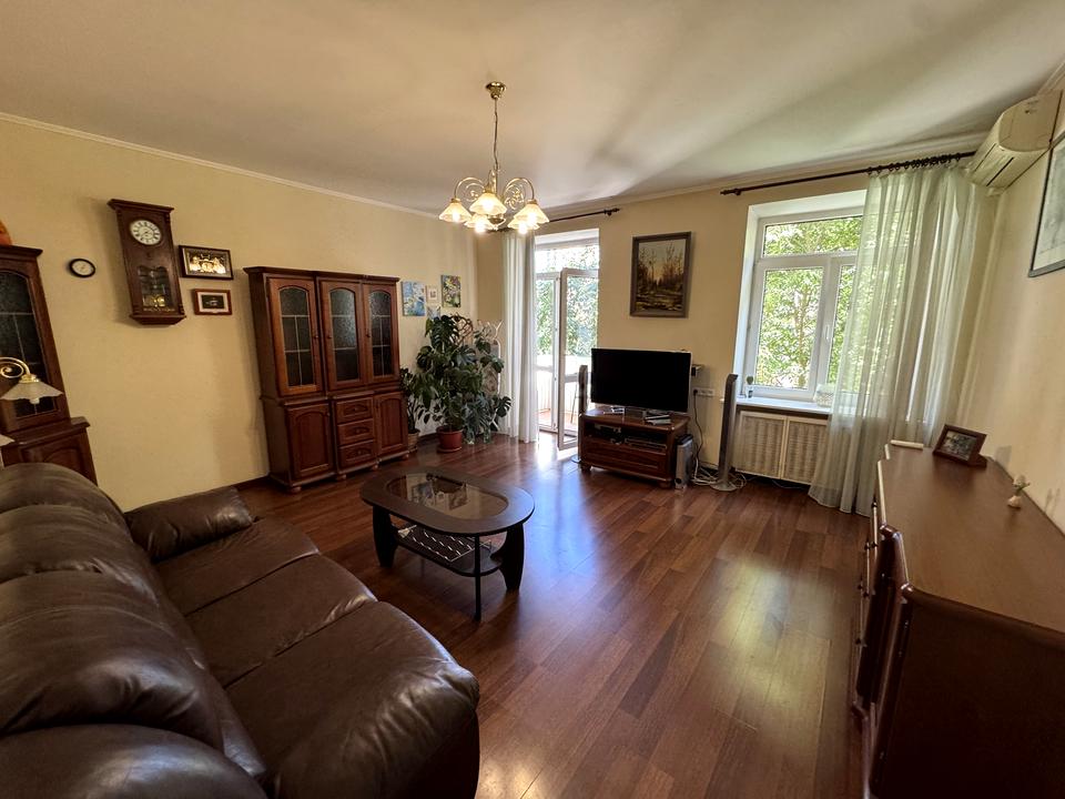 • вітальня з диваном, TV-зоною, телевізором із саундбаром, меблями з натурального дерева, кондиціонером та виходом на балкон з видом у зелений двір;