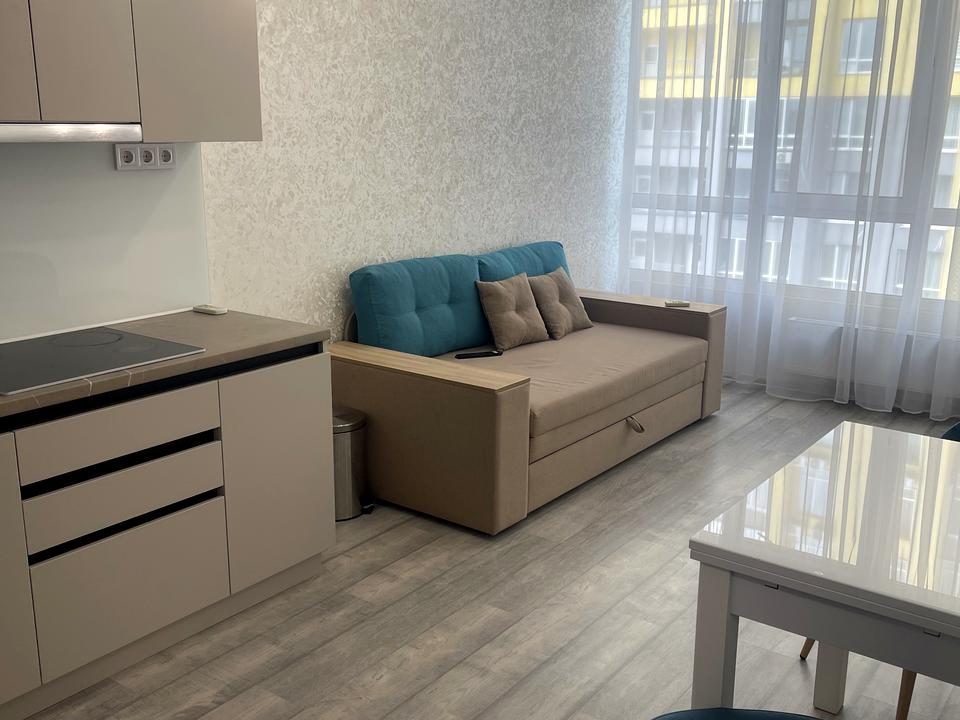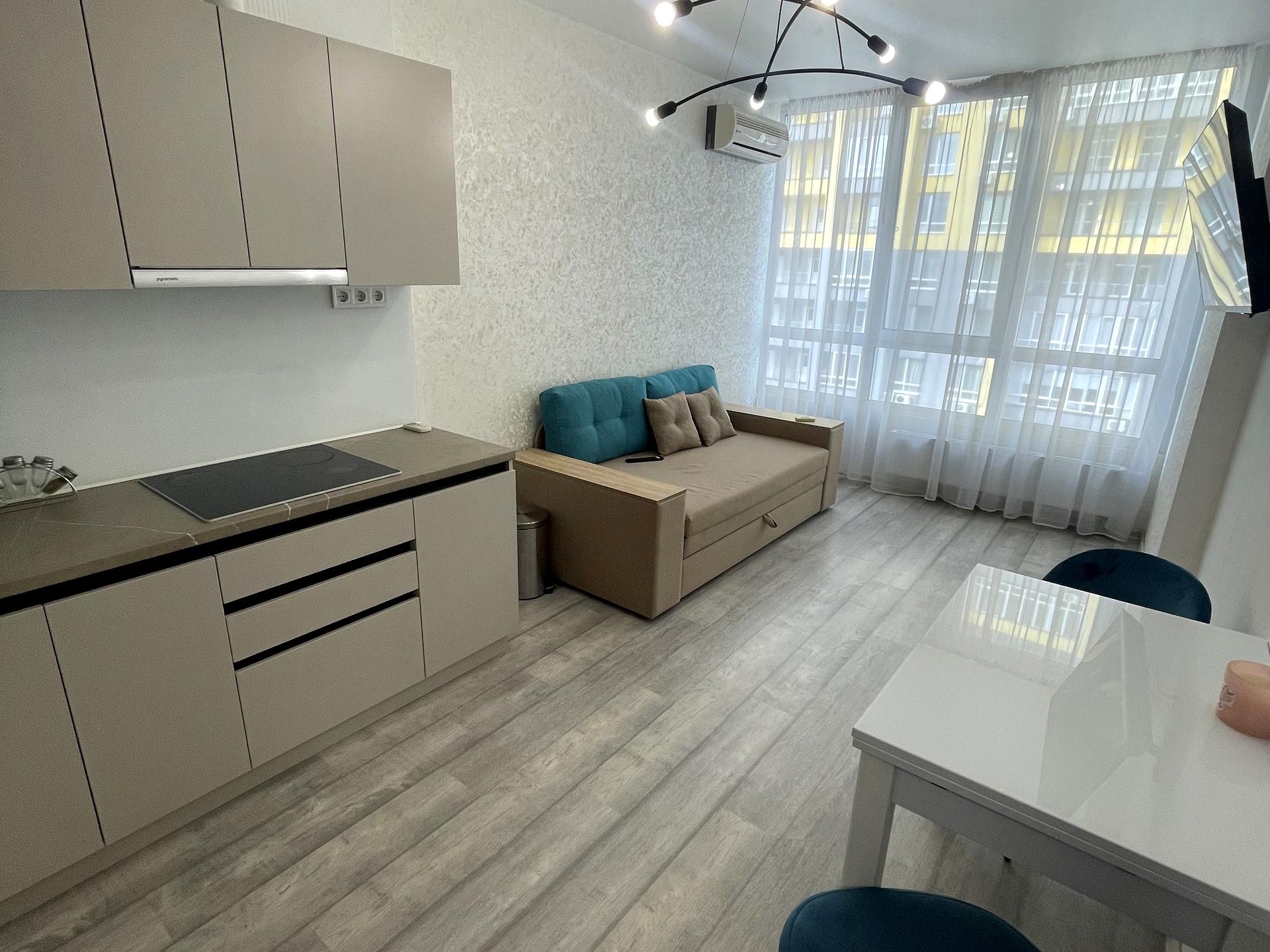 Квартира світла, комфортна, облаштована меблями та технікою. Є кімната- студія, окрема спальня, зручна ванна кімната, містка гардеробна, прихожа. З меблів - розкладний диван, двоспальне ліжко, вбудована кухня , тумби, стіл. Техніка - кондиціонер, холодильник, бойлер, пральна машина, телевізор, інше.