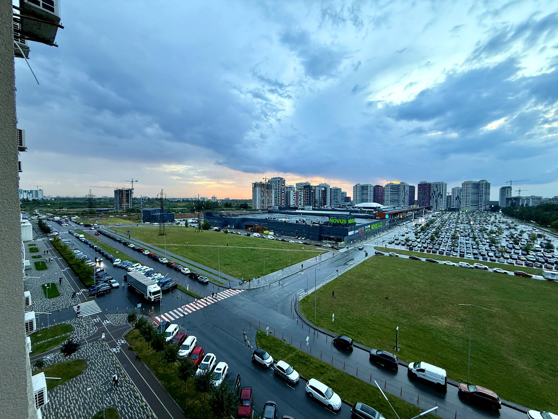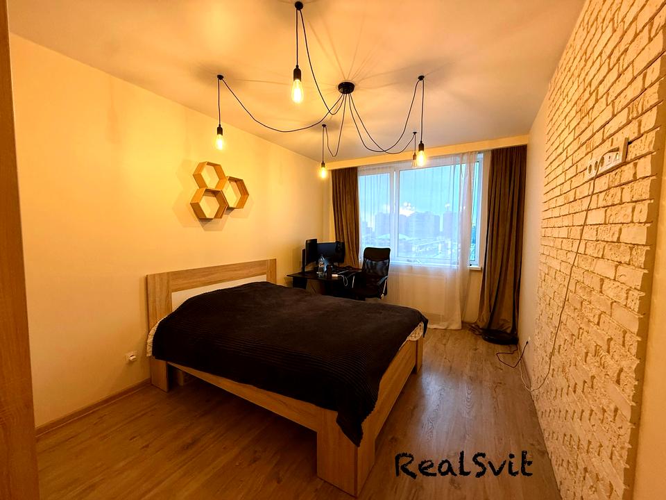 У кімнаті великі вікна з красивим краєвидом на захід сонця, містка шафа, двоспальне ліжко. (Стіл, стілець та робот пилосос забере попередній орендар).