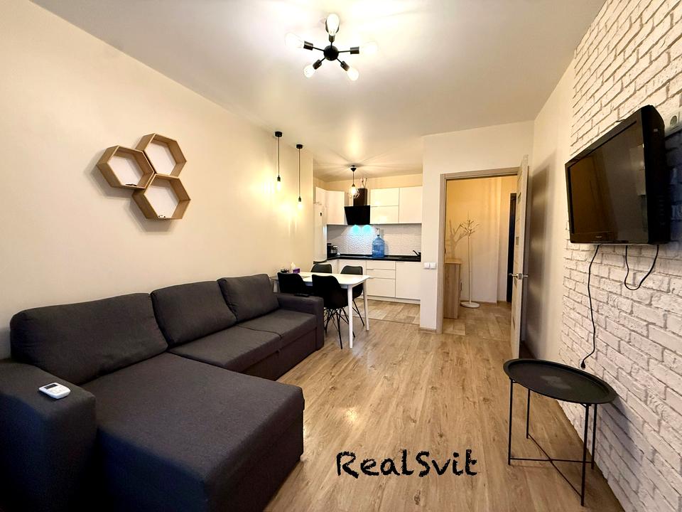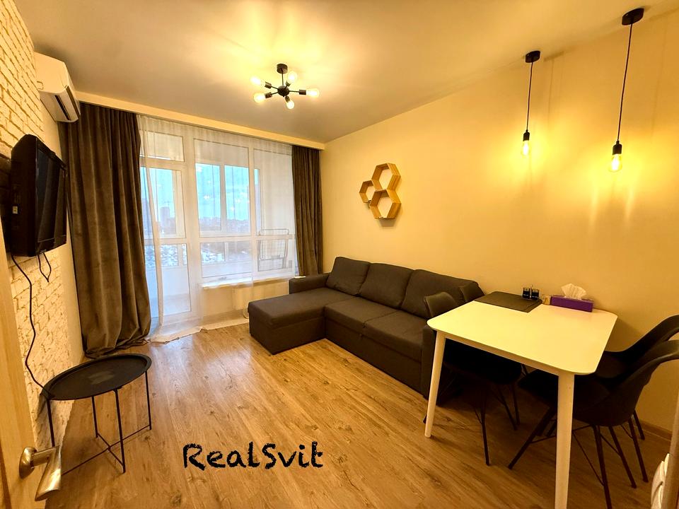 У кухні-студії - гарна біло-чорна вбудована кухня, холодильник, мікрохвильова піч, варильна поверхня, витяжка. Є розкладний диван, смарт телевізор, кондиціонер, стіл зі стільцями. Є вихід на засклену лоджію.