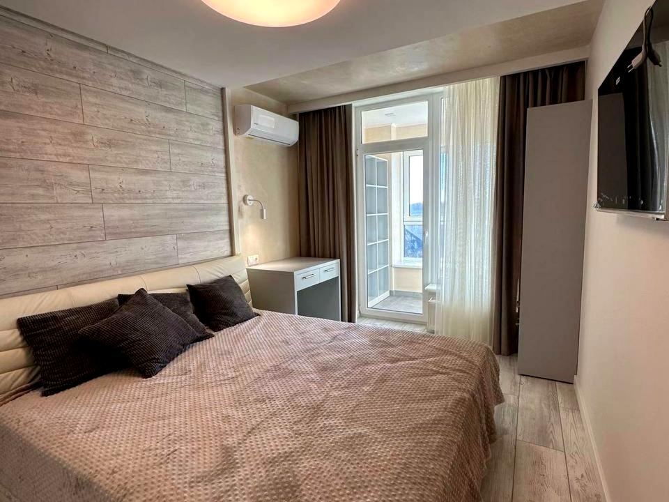 Спальная комната 1: двуместная кровать с ортопедическим матрасом, встроенный вместительный шкаф, кондиционер, телевизор, прикроватные тумбы.