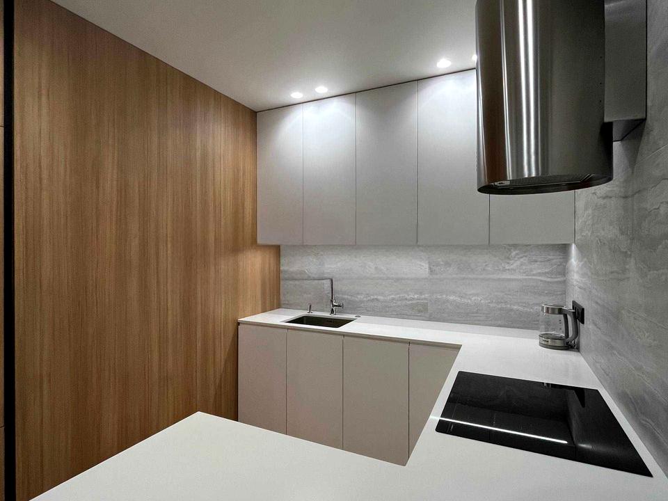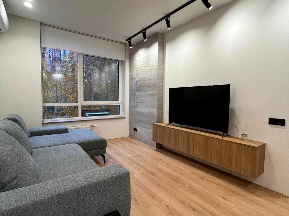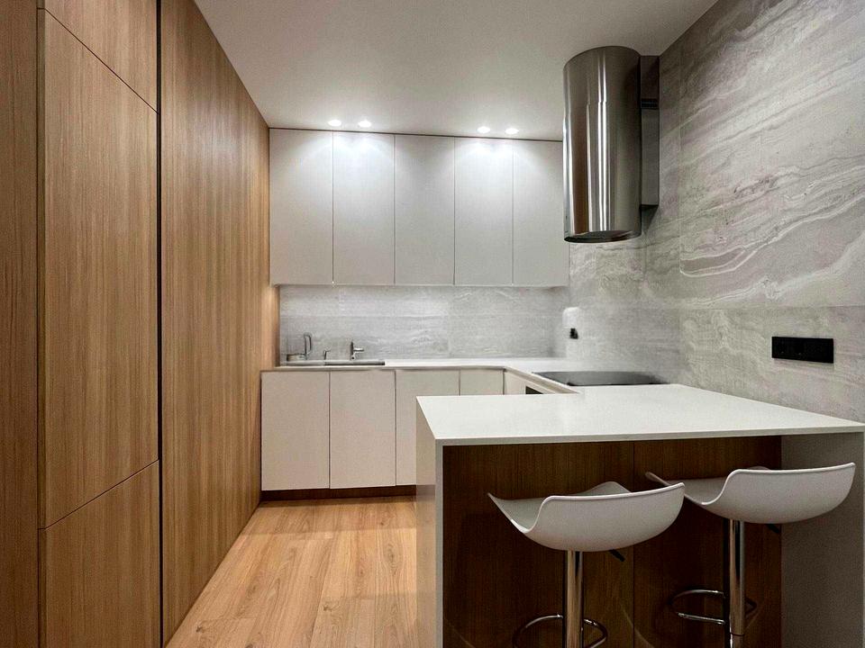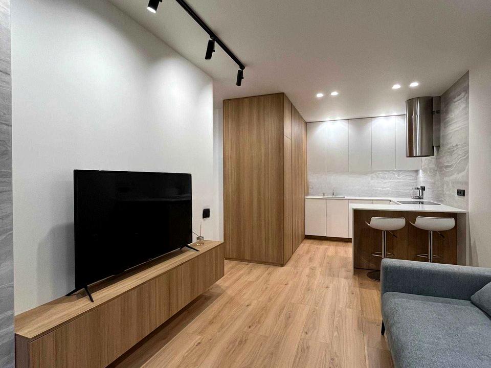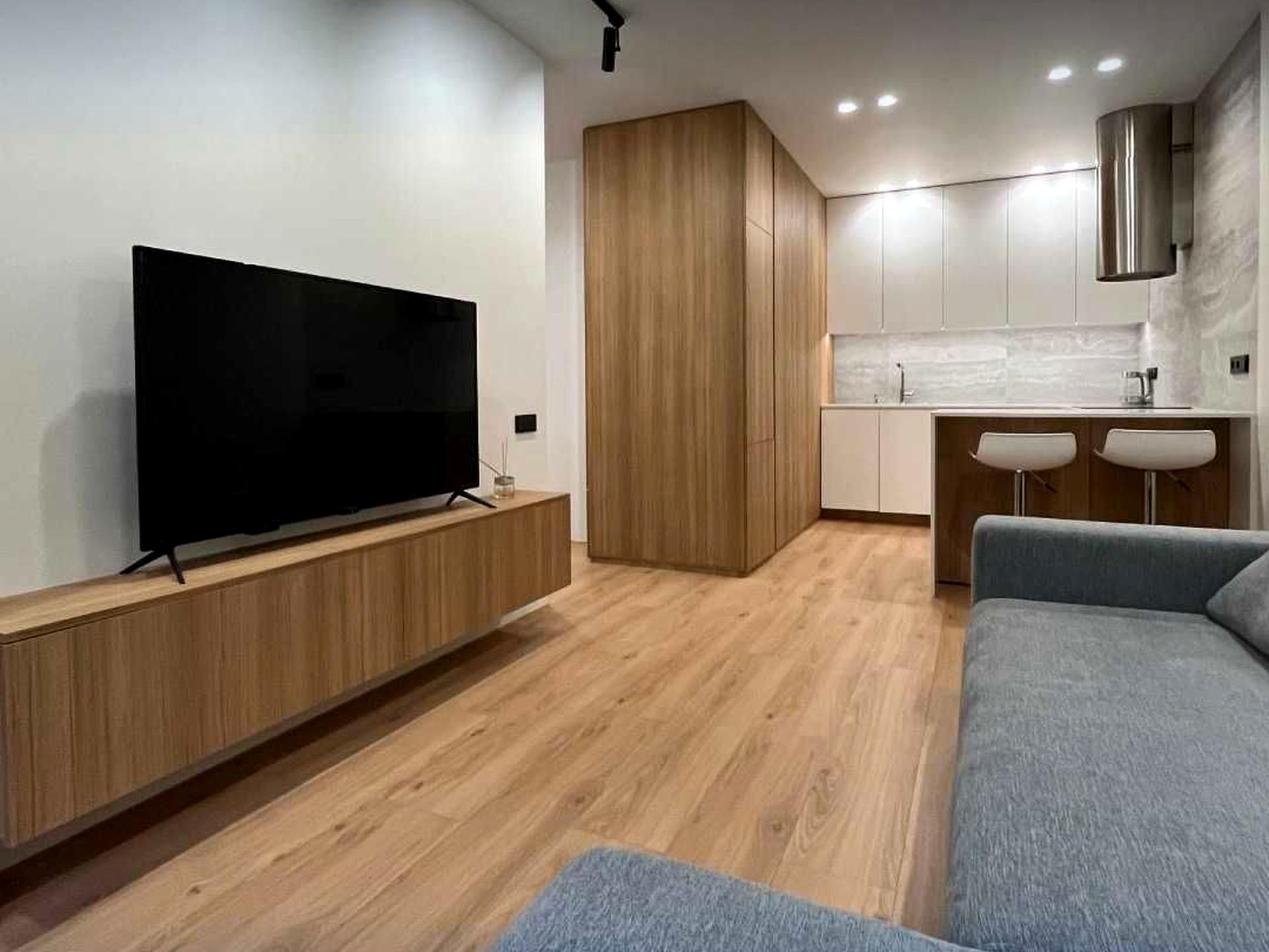 Кухня-вітальня, яка так і надихає створювати кулінарні шедеври та проводити вечори з друзями або насолоджуватись фільмами в затишній атмосфері. Зона вітальні оснащена великим диваном та ще одним телевізором. Кухонна зона візуально відокремна та має барну стійку для прийому їжі.