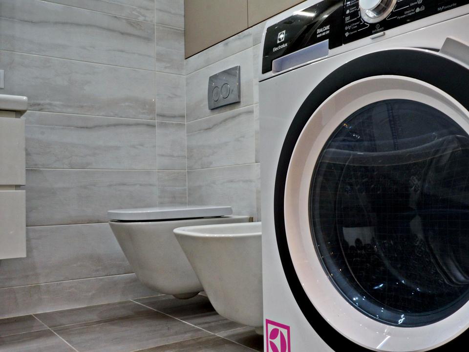 ВАННА КІМНАТА оздоблена імпортною плиткою, з практичною та функціональною плануванням. У суміщеному санвузлі встановлена ванна, раковина з тумбою та дзеркалом, підвісний унітаз і поруч біде, електричний бойлер, а також нова пральна машина-автомат.
