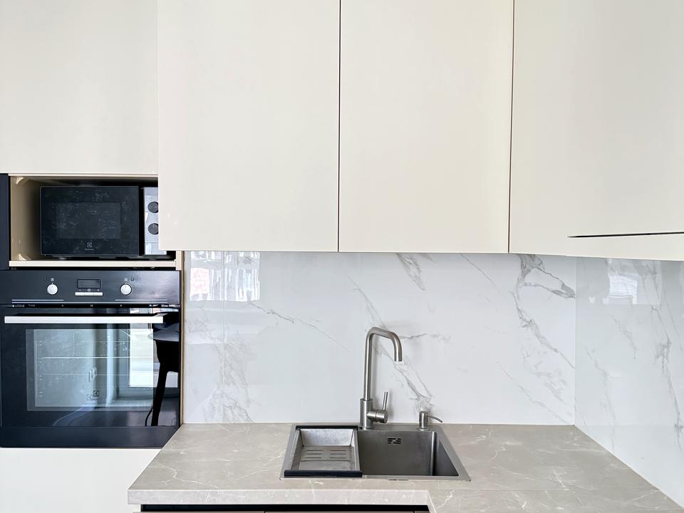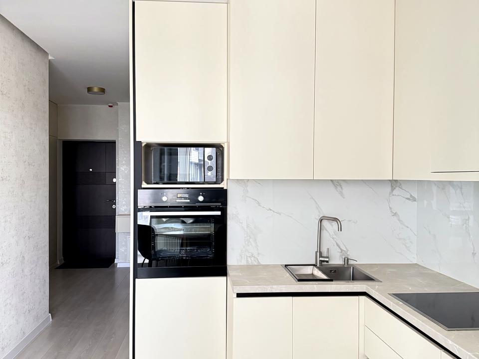 • Простора кухня-студія з вбудованою технікою (варильна поверхня, духовка, мікрохвильова піч, холодильник, посудомийна машина);