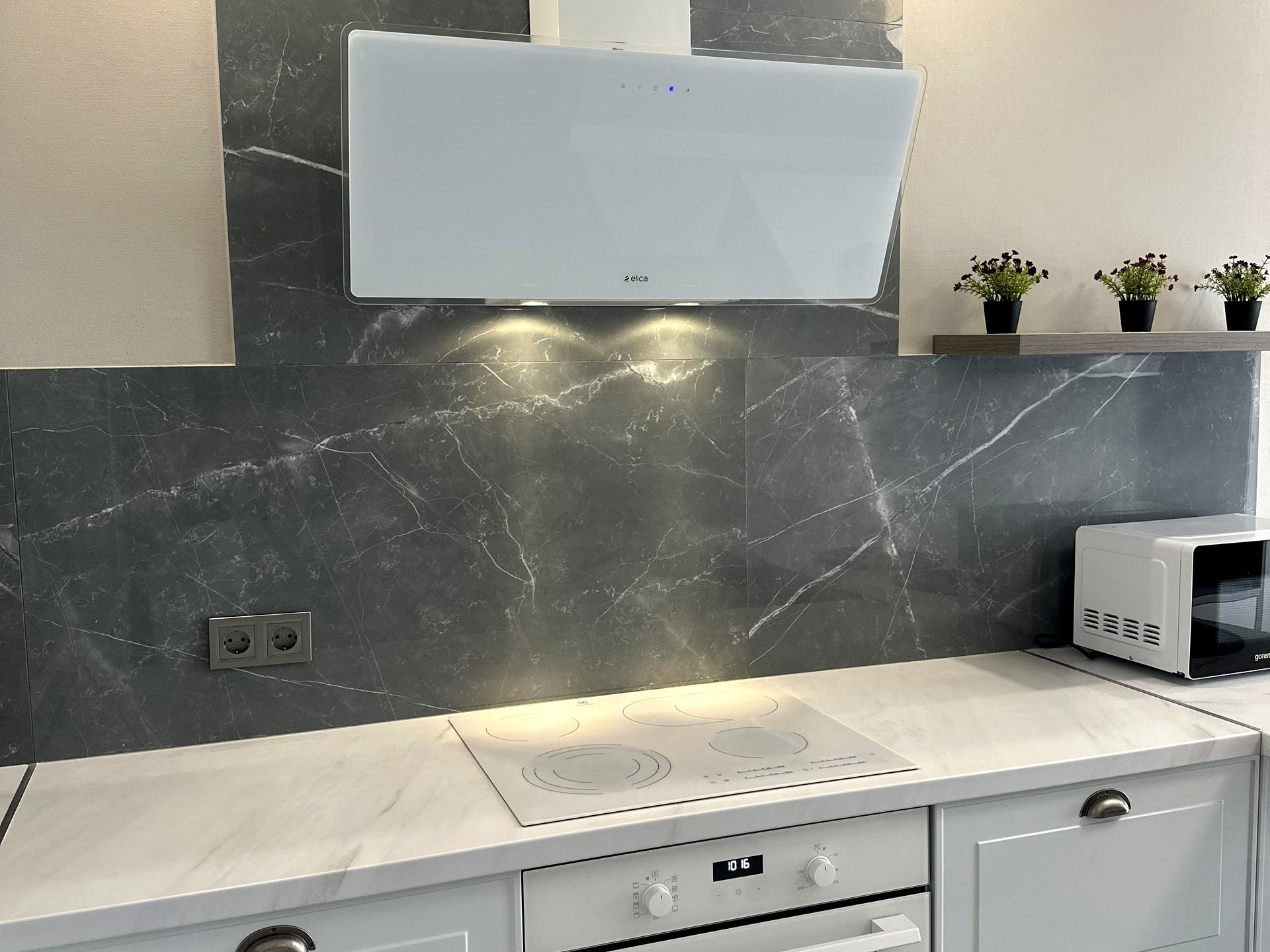 Квартира облаштована, є посудомийна машинка, електро плита, витяжка, духова шафа, мікрохвильова піч, холодильник, телевізор, бойлер, рушникосушка, ванна, бойлер, ліжко, диван розкладний, кондиціонер, підігрів підлоги