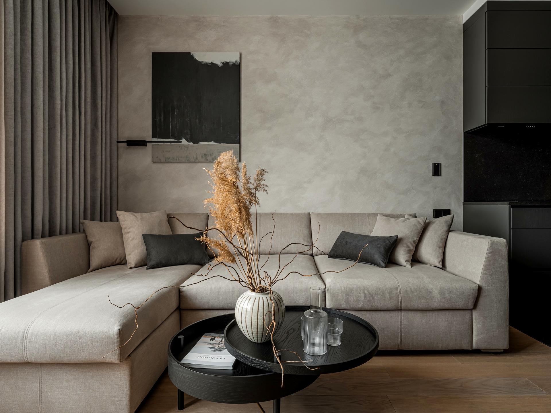 — Кухня-вітальня з кутовим диваном і панорамними вікнами