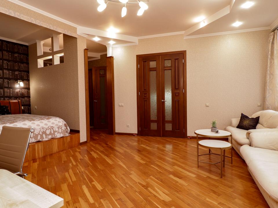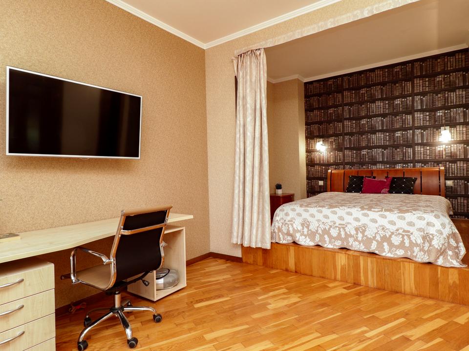 • Кімната (23 м²): простора, з нішою під двоспальне ліжко з ортопедичним матрацом, два розкладні дивани, кондиціонер, телевізор, вихід на засклений балкон із красивим видом.